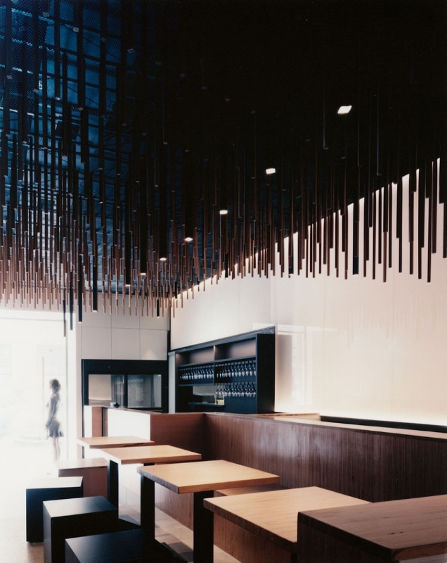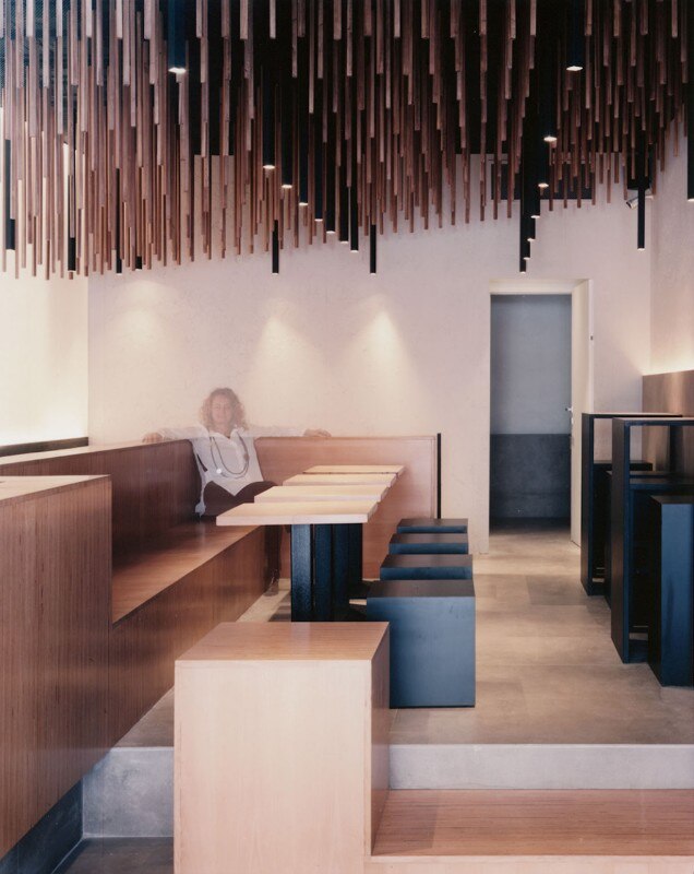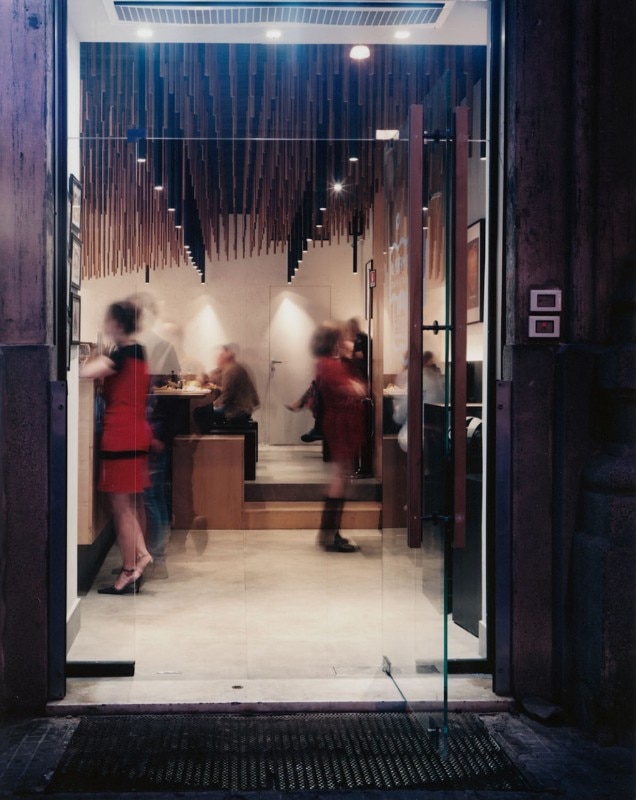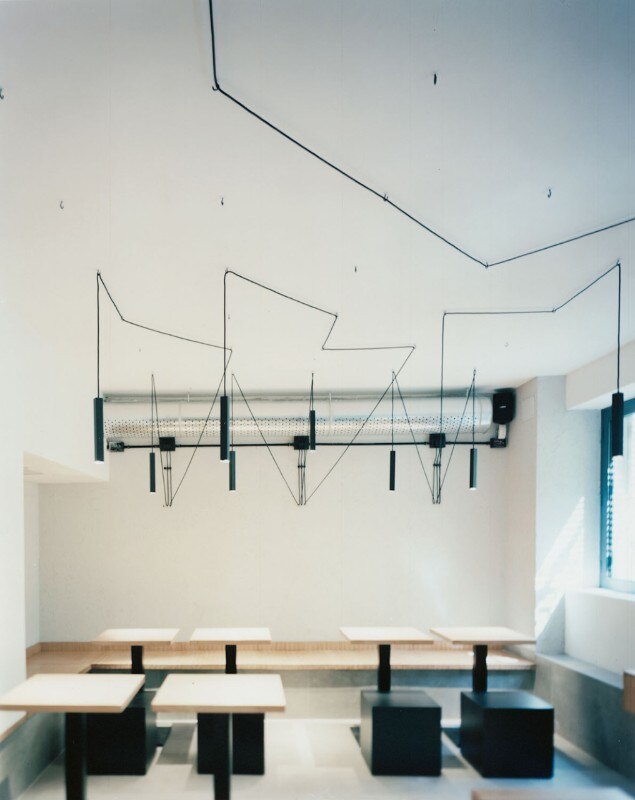 The space is conceived to be not only an interior, but almost like a covered arcade that winds around itself, fanning out into a collective room. The attempt was to translate the dynamic perception of a spring mechanism into a concrete dimension by means of spatial relations between shapes and materials. The bar–counter, for example, is continued as the backrest of the bench that lines the wall along the full length of the room, while the wave of canes hanging from the ceiling slides over the stair to guide customers to the underlying level.