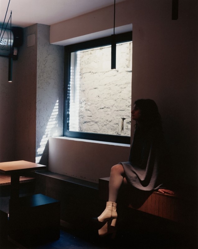 Mainly it is a dialogue between lighting and surfaces by means of different intensities of natural and artificial light. Glass multiplies the space by its reflectiveness; walls are diffusely illuminated to highlight different textures of non–coloured plaster; and spotlights give direct light to the tables at various heights.