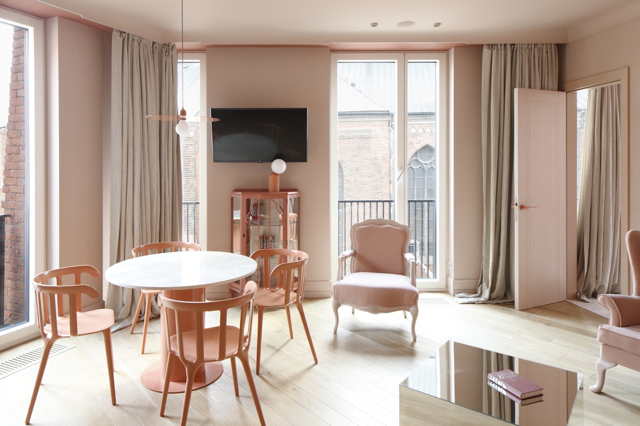 Nestled between the Pharmacy Museum and the House of the Blackheads in Riga, stands the Redstone Boutique Hotel with its six floors and eleven rooms that have a distinguishing mark: monochromatism. A four-colour palette begins above the first two floors occupied by the St. Petrus Restaurant.