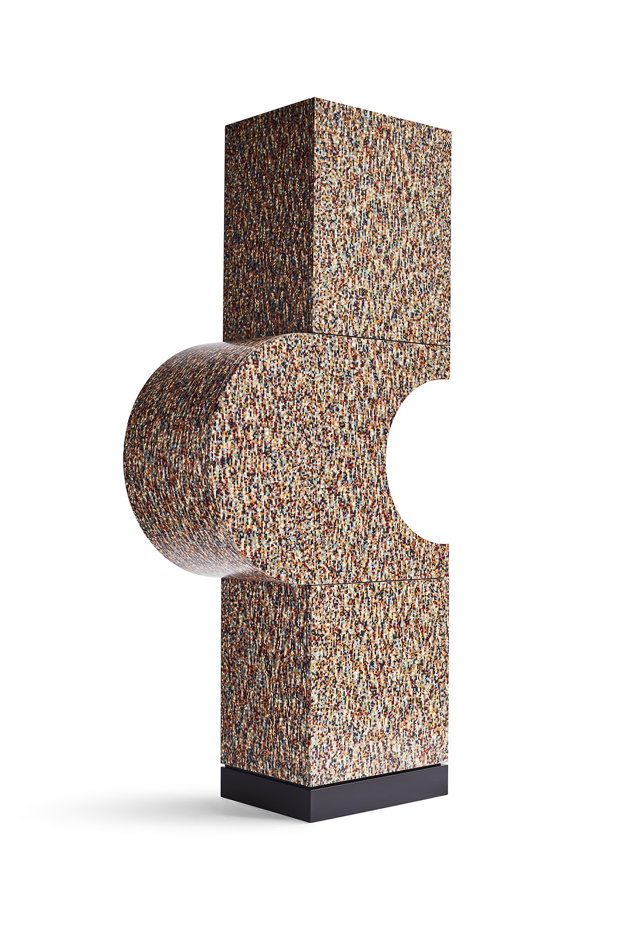 Qfwfq and Ayl are made soley in Mendini's black and white, and coloured veneer respectively, while Luna & Sole is constructed from a combination of both.