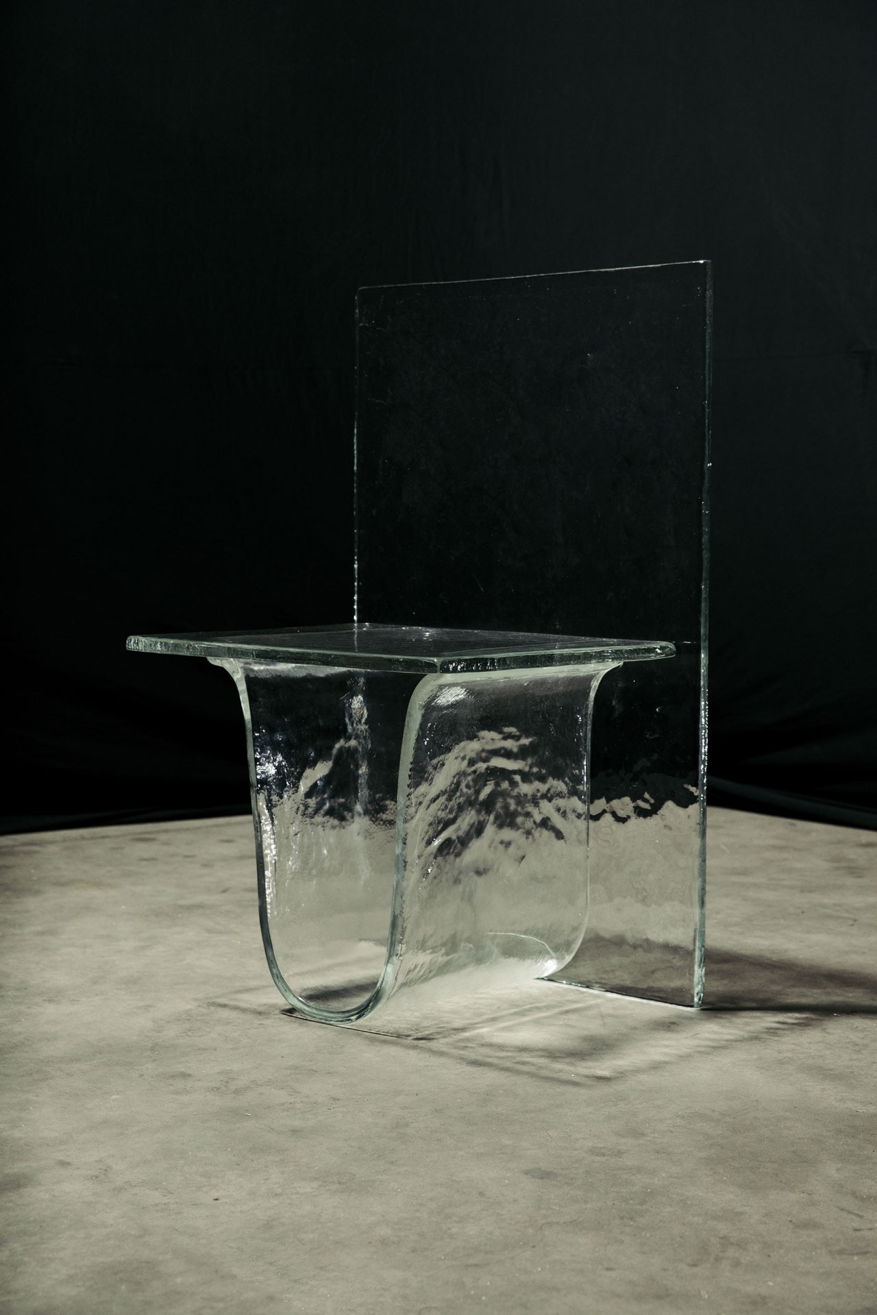 Simple as it seems, the project required a complex production process, possible only with an exact junction of timing and temperature. The natural fall of the material determines here the final shape of the product through a process where hot glass sheets are laid over steel pipes and suspended between steel bars.