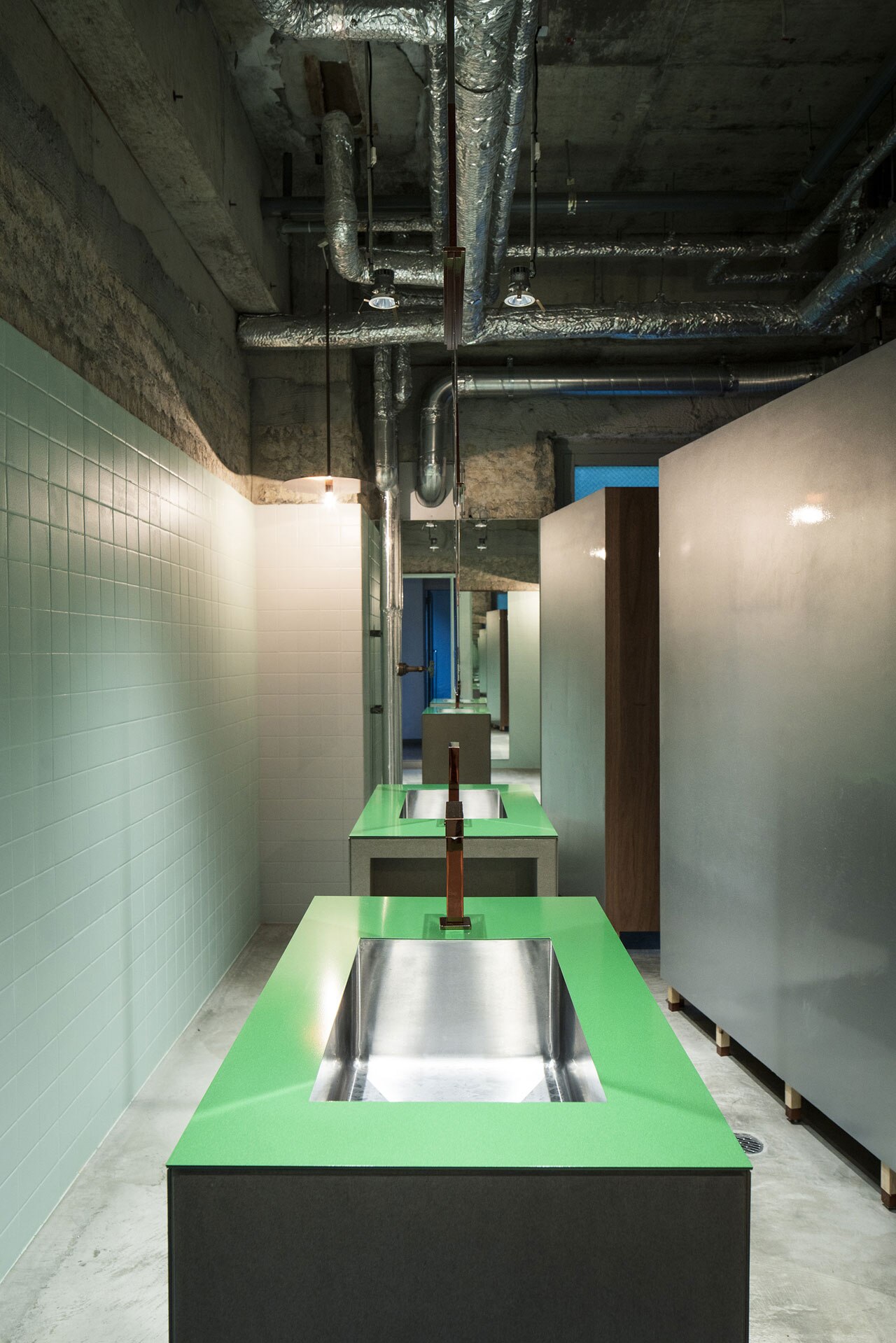 Marked by geometric shapes and graphic signage, the renovation of the toilets stops short of the ceiling, with tiles covering a band of the wall reaching just 2.3 meters high. Above that the space is left unfinished, revealing the original framework and plumbing. Two mint green central basins define the bathroom’s foyer, which is visually connected to the common corridor, and sit under two red-framed mirrors that hang from the ceiling, giving the space an industrial character, unexpected in such environment.