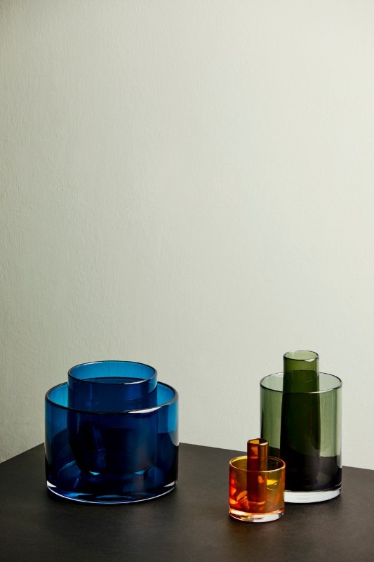 Coloured tower #011 from Romain Kloeckner’s Made With Pleasure collection stands between Mound by Victoria Andrew – a hand-built structure of brick clay and Canary Wharf clay – and the metal-glazed Iguana Vase by Floris Wubben. Wubben’s cylinder forms part of the Dutch designer-maker’s Pressed project, in which he explores the behaviour and properties of clay when moulded in a self-developed extrusion machine.