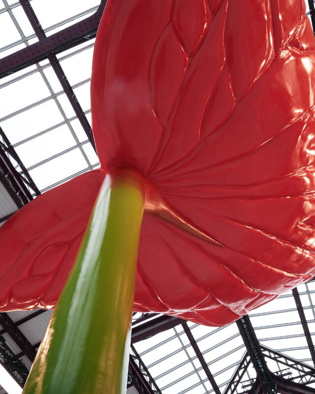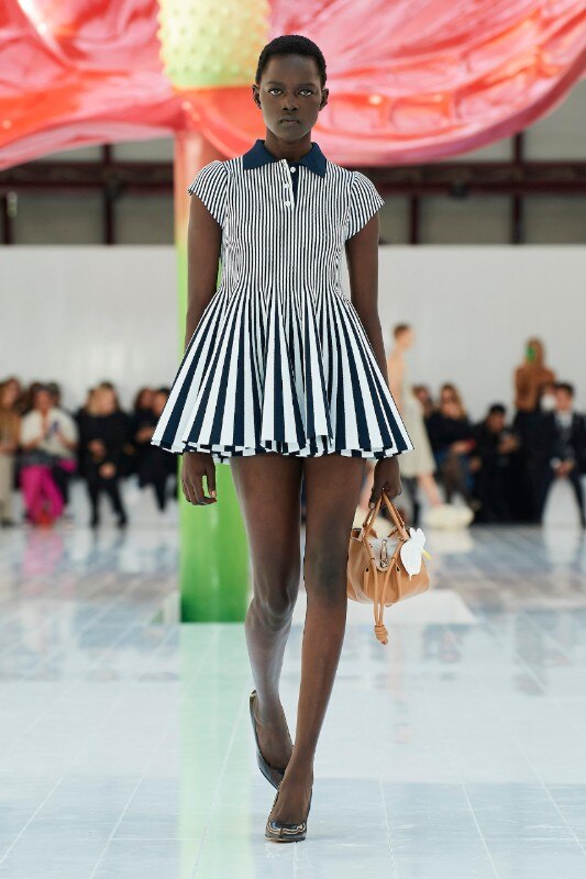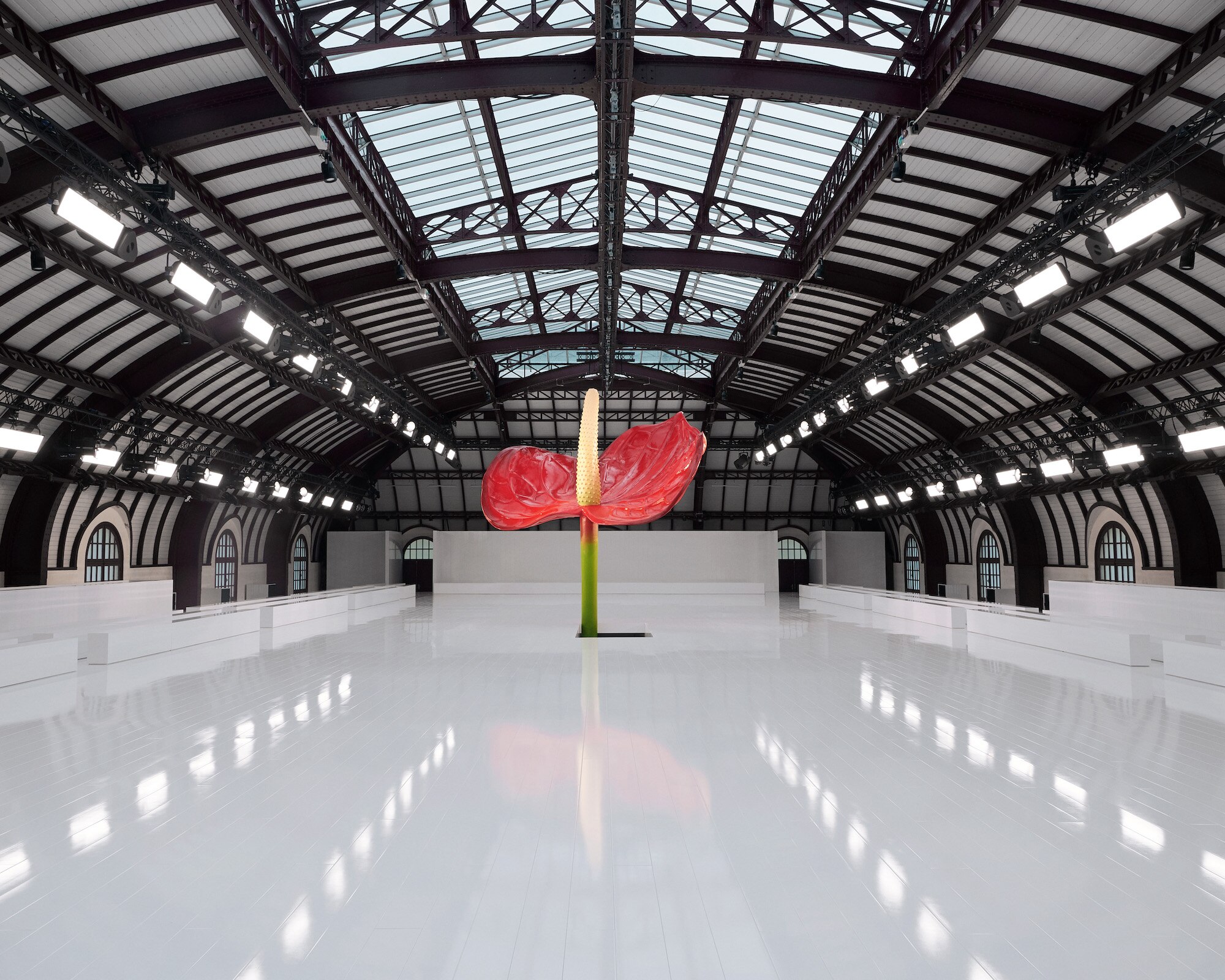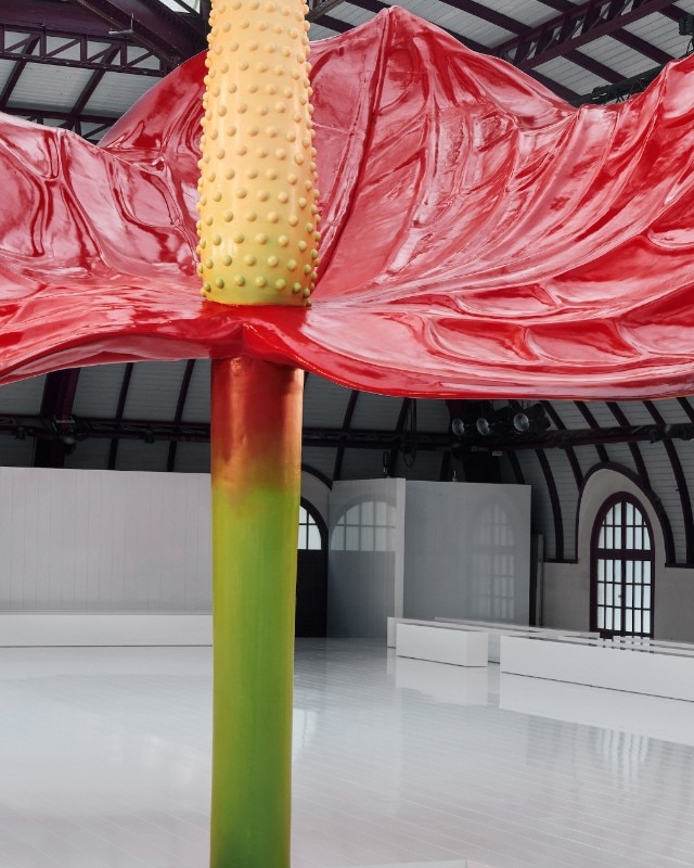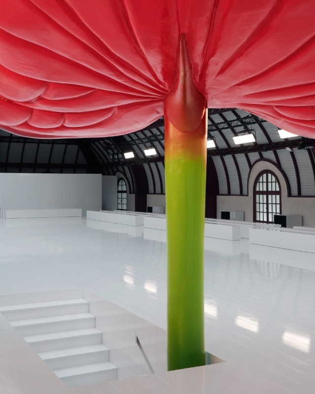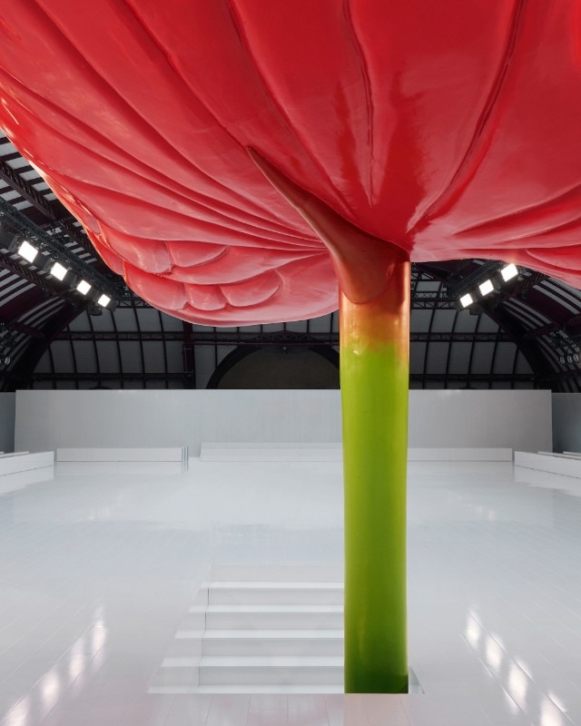 At the center of the catwalk is a huge fiberglass reproduction of an anthurium flower. Also, on the catwalk, Jonathan Anderson replicates the flowers several times – bright white, lime green, classic red - in various sizes, becoming rigid corsages on dresses or sprouting from shoes. The collection is in continuity with the plastic fascination that the British designer has been experimenting with for several collections, constant reuse of everyday objects decontextualized, scaled, and distorted, almost in a postmodern gesture. Everything is reduced to build the new silhouette: small hourglass dresses, knitted pullovers, leather, and hunting jackets in mini versions. Technology in this collection appears in the form of pixels that define hoodies in knitwear, t-shirts, and slouchy trousers.