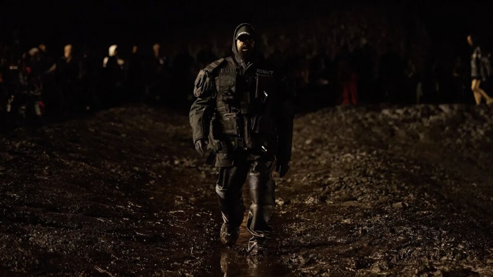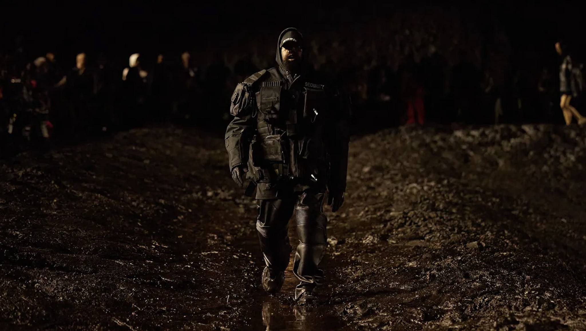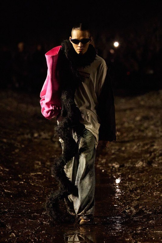 Demna Gvasalia’s latest collection paraded this time in the Parisian suburbs, with the title-manifesto “The mud-show.” With a set designed by Spanish artist Santiago Sierra, the very space of the fashion show was an immense pit full of mud, whose trodden runway was dotted with pools of water. In the invitation, the designer explained that it was a metaphor “to dig for the truth and to keep our feet on the ground. I hate boxes, I hate labels, and I hate being labeled”. This statement laid the foundation for a provocative collection, which continued to create a dystopian mood amidst dirty counter clothes and realistic dolls strapped to the chest. The clothes exuded the brand’s now trademarked dark glamour: twisted dresses that knotted on the body, a sequin dress with the hem dragging in the mud.