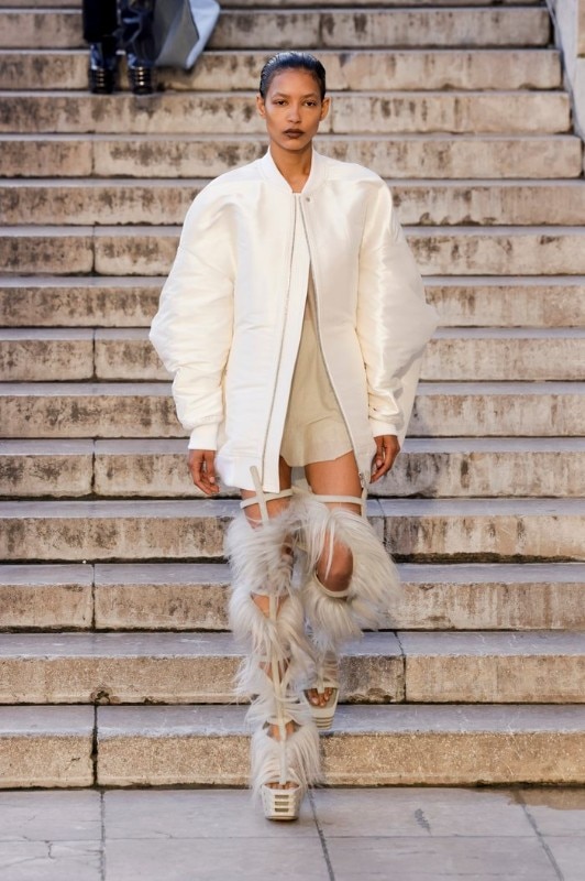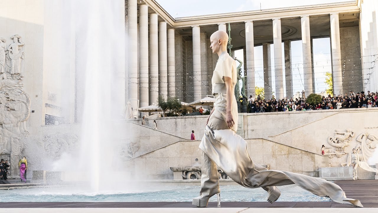 The designer set the presentation of the new collection in the vast court of the Palais de Tokyo in Paris – as did his colleagues at Acne Studios – with the central fountain shooting a monumental water spire into the air. The collection was inspired by the figures of ancient Egypt and biblical epics. The collection was permeated with a feeling of ritual and ceremony: silhouettes were draped around the body, shoulders were low-cut, the shape of a jacket evoked the shell of a scarab. Models descended the staircase in elaborately designed sculpture dresses, winding trainers and transparent tulle dresses in econyl. Most surprising was one of the works in the collection: an otherworldly ‘gelatinous’ skin treated with glycerine to appear transparent.