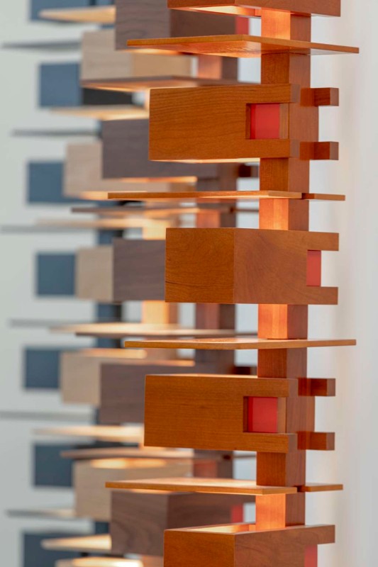 A tower of wooden boxes, stacked and interspersed with thin boards, from which a soft, discreet light shines as if from a lantern. The sculpture is the work of American architect Frank Lloyd Wright (1867-1959), that “whimsical and ingenious old man of Taliesin”, inclined to “polygonal and expensive” constructions, as Gio Ponti described him in a 1941 editorial (Domus 235).