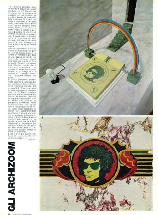 Several years earlier, and much closer to the release of the song, in October 1967, Sottsass himself introduced the Archizoom group to the readers of Domus 455. He did so by presenting four beds, a manifesto of the language and philosophy of the radical Florentine architects. One of these, Arcobaleno, was topped by a rainbow-colored arch resting on two dark marble nightstands and featured a large image of Bob Dylan on the bedspread. The singer’s face appears in other drawings and projects by Archizoom, emphasising the centrality of the artist's poetic vision to the Italian radical architecture community.