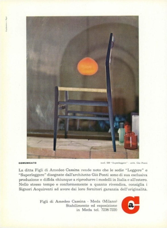 “In low light it will be even lighter, because it will seem to stand on just two legs,” Ponti once said when presenting the design—a design that has proven capable of withstanding not only physical loads but also the passage of time. The Superleggera’s success was immediate and difficult to contain, to the point that in 1960 Cassina felt “forced” to publish a very explicit notice in Domus: “The company Figli di Amedeo Cassina announces that the ‘Leggera’ and ‘Superleggera’ chairs designed by architect Gio Ponti are of its exclusive production, and it warns anyone against reproducing these models in Italy or abroad.”