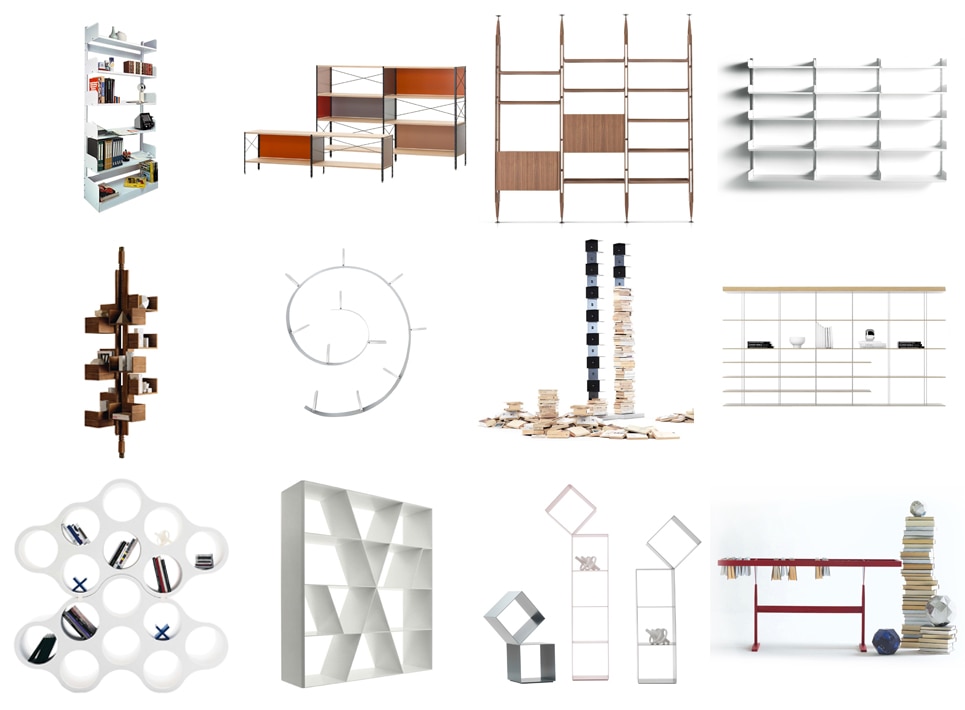 Usually vertical in form, domestic bookcases provide for a certain level of “modularity”, beginning with standard sizes of approximately 100 x 200 cm, it is often the case that they “grow” over time. Also, for this reason, their form is fairly simple, respecting the rule of repetition of horizontal surfaces supported by side supports, or a kind of honeycomb made up of square units.