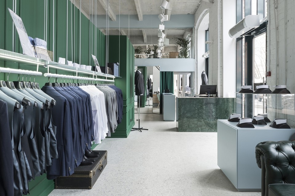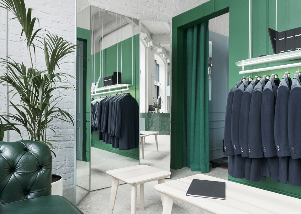 Designed by Russian architect Alexander Volkov, the interior includes a showroom, a lounge area, a tailoring workshop and service areas.