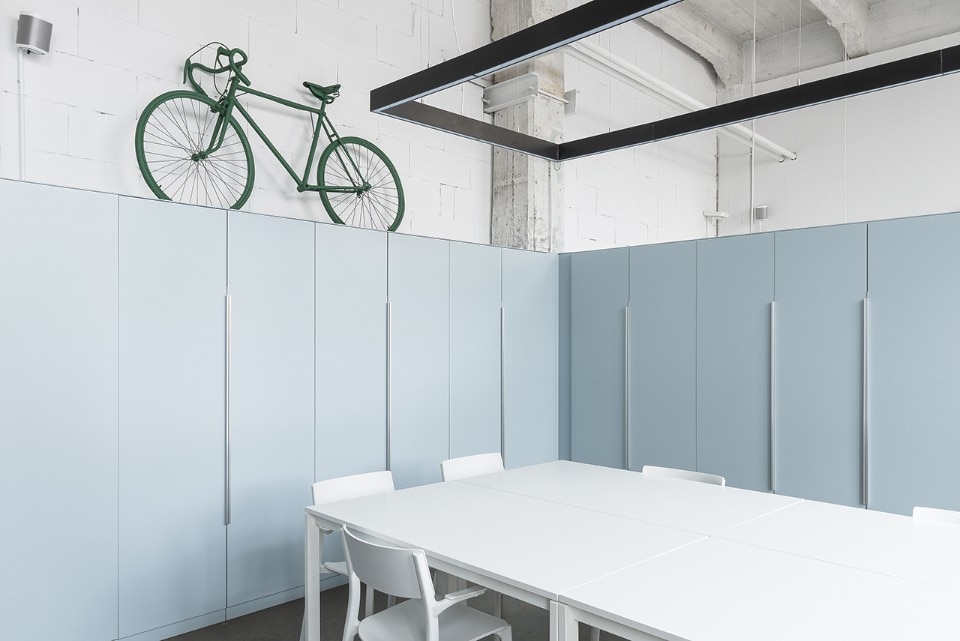 The shop features a combination of industrial elements and classic and essential furnishings, with the particular use of emerald green and a blue-grey to define the different areas of the showroom.