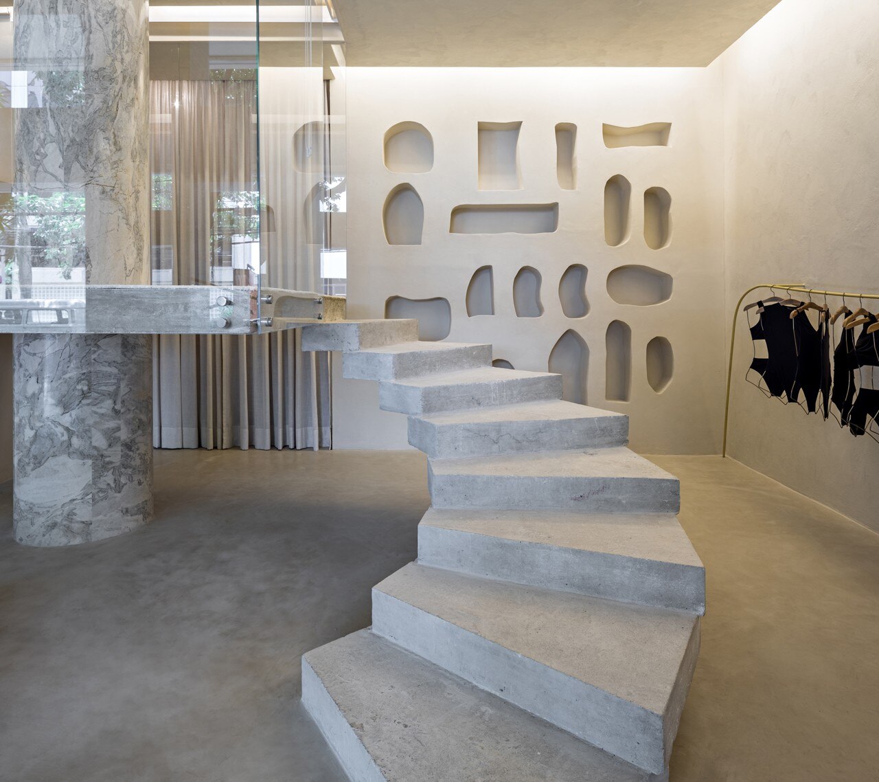 In a mezzanine inside a residential building in Leblon, a luxury district just south of Ipanema, Brazil, MNMA studio designed the interiors of Haight’s boutique, a Brazilian brand of monochrome swimwear. According to the clothing’s minimalism, the concept focused on primitivist forms, colors and materials, which celebrate a return to the origins with a reference also to the organic issue.