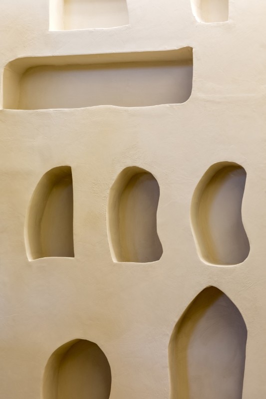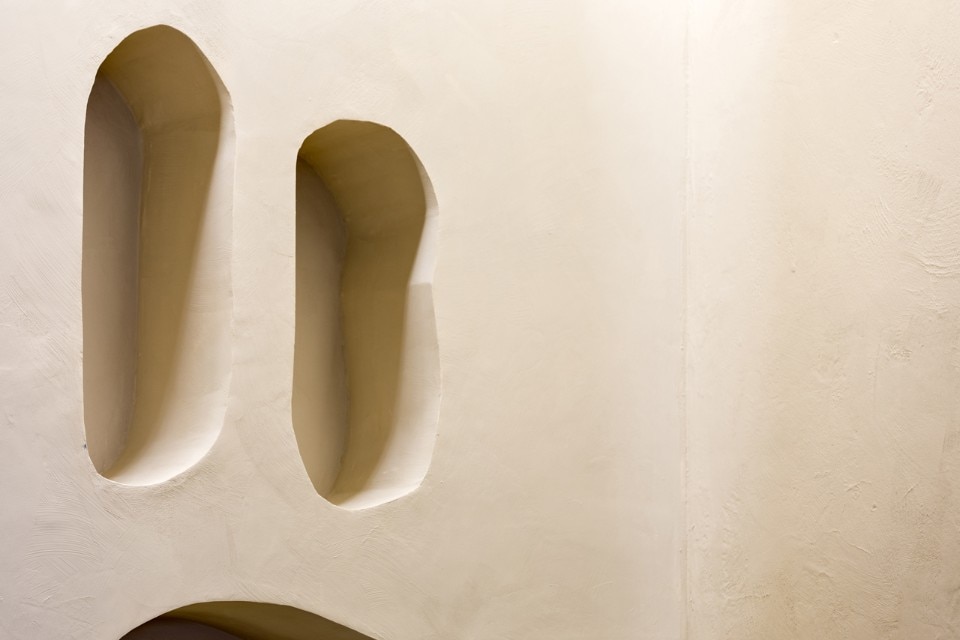 Italian partners Passalacqua developed specifically for this project tonic cements, paints and other clay-based coatings, and the sculptural space is defined by unpolished stones, exposed concrete, a special mineral painting and freestyle shapes that, overall , return a warm and archetypal, sacred, environment. Even the sidewalk and the façade were rebuilt in stone to make inside and outside uniform and welcome the customers at first sight.