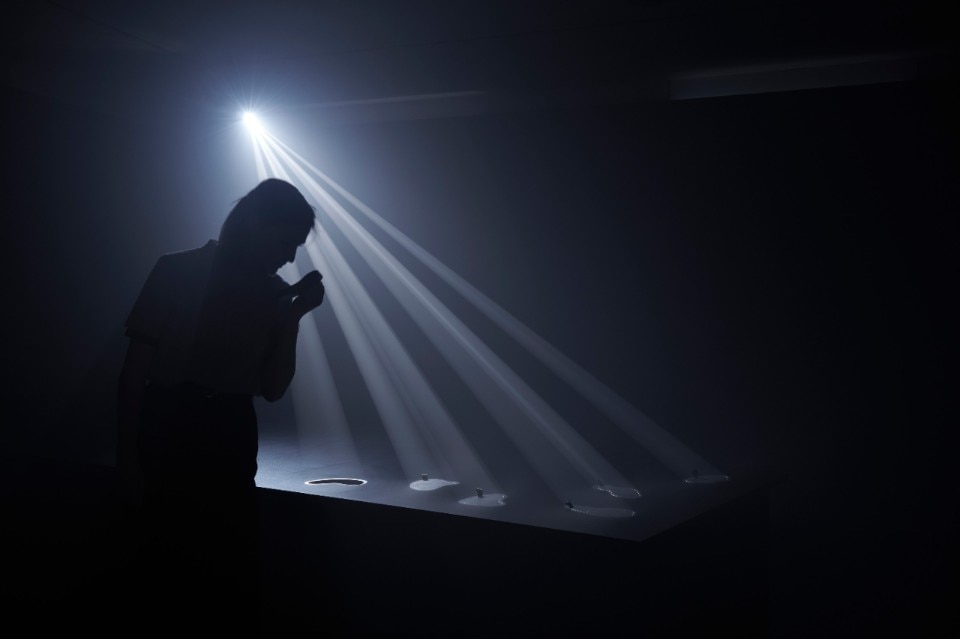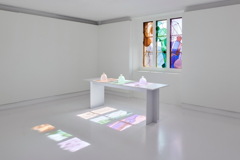 Tim Simpson and Sarah van Gameren – the founders of studio Glithero – answered mudac’s brief by conceiving a series of poetic site-specific installations that play with light and air. Among the various analogue devices are: tiny glass phials that slowly release their fragrances when the strings of the floating balloons attached to their stoppers are pulled; giant paper fans that diffuse perfumes when opened; elegant glass bells realised by Valérie de Roquemaurel, a glass blower based near Lausanne.
