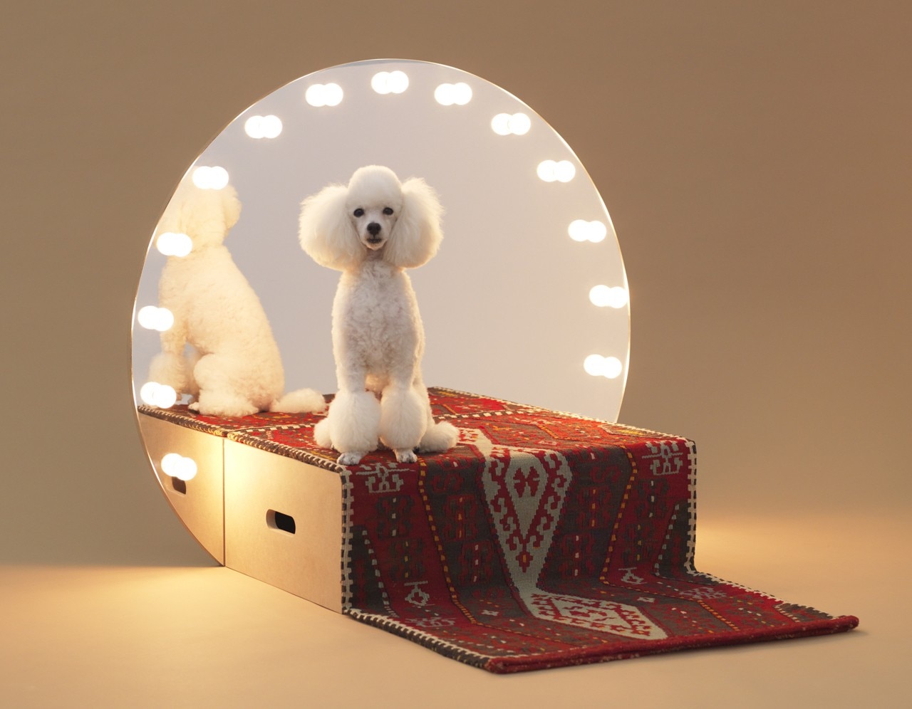 Ironic, but at the same time alarming, the video sets the tone for the first chapter of the exhibition, “Companions and Counterparts”, which features, among the others, the project Paramount by Konstantin Grcic. Similar to the workstation of a professional make-up artist, the small structure houses a tailor-made mirror for poodles, although it is common knowledge that dogs are not able to recognise their own reflection. At the same time glamorous and kitsch, the project sums up the vanity and embarrassment that characterising dog competitions.