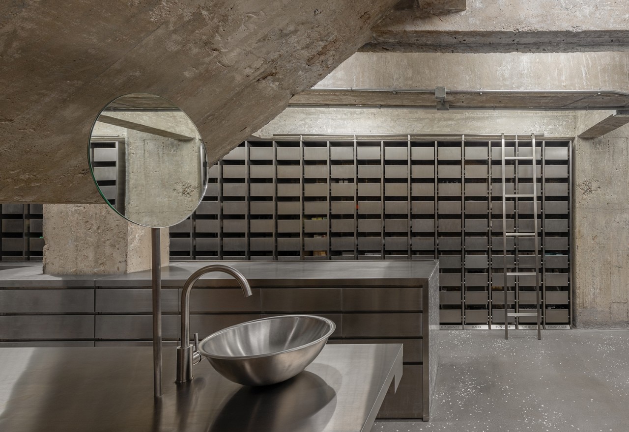 The walls of the stainless steel drawers placed in the form of a curtain wall on the mighty concrete pillars prepare for the scientific storage of the products and confers the space an orderly and relaxing, almost austere image, reminiscent of the order and precision of the virtual world. Small signposts invite the guests to open the drawers that reveal their contents.