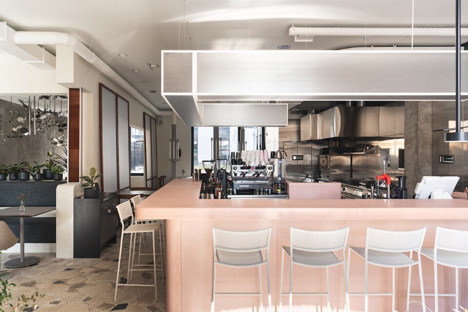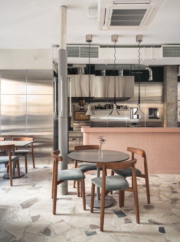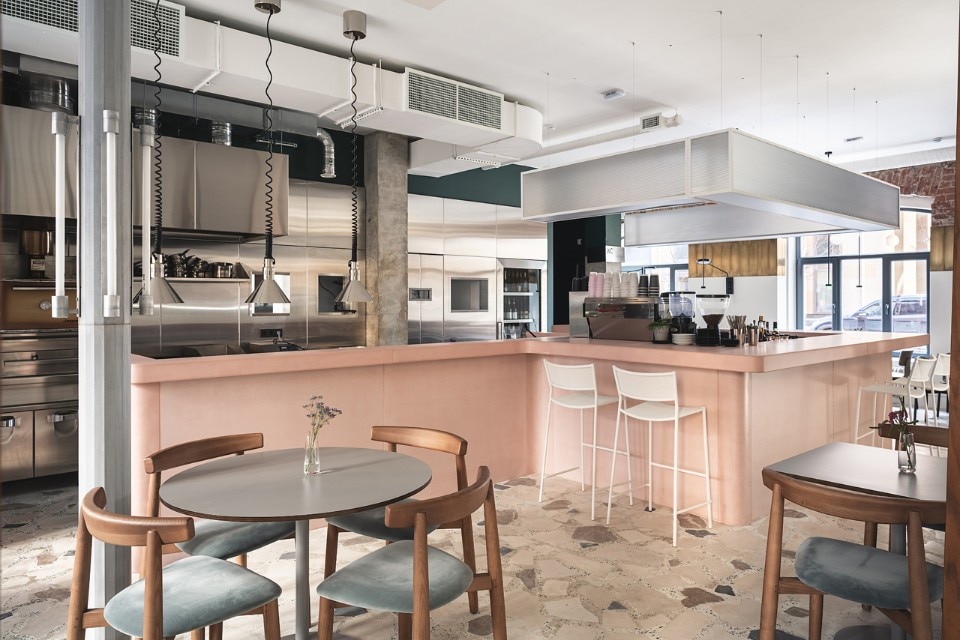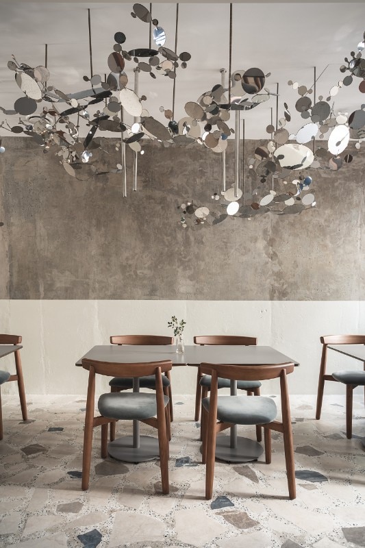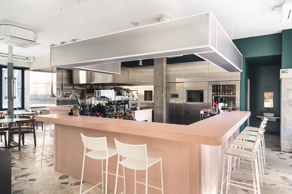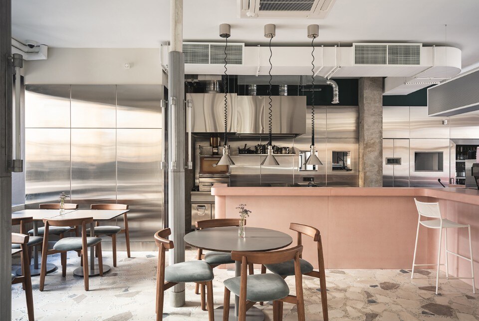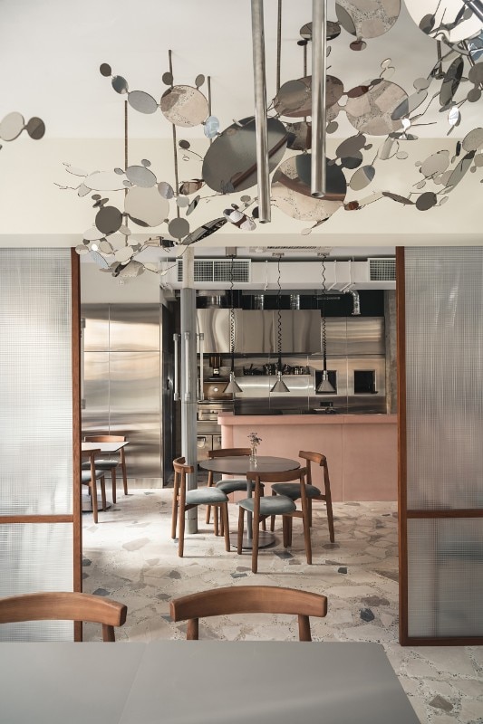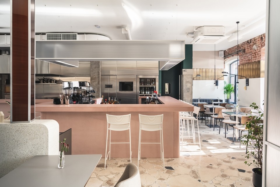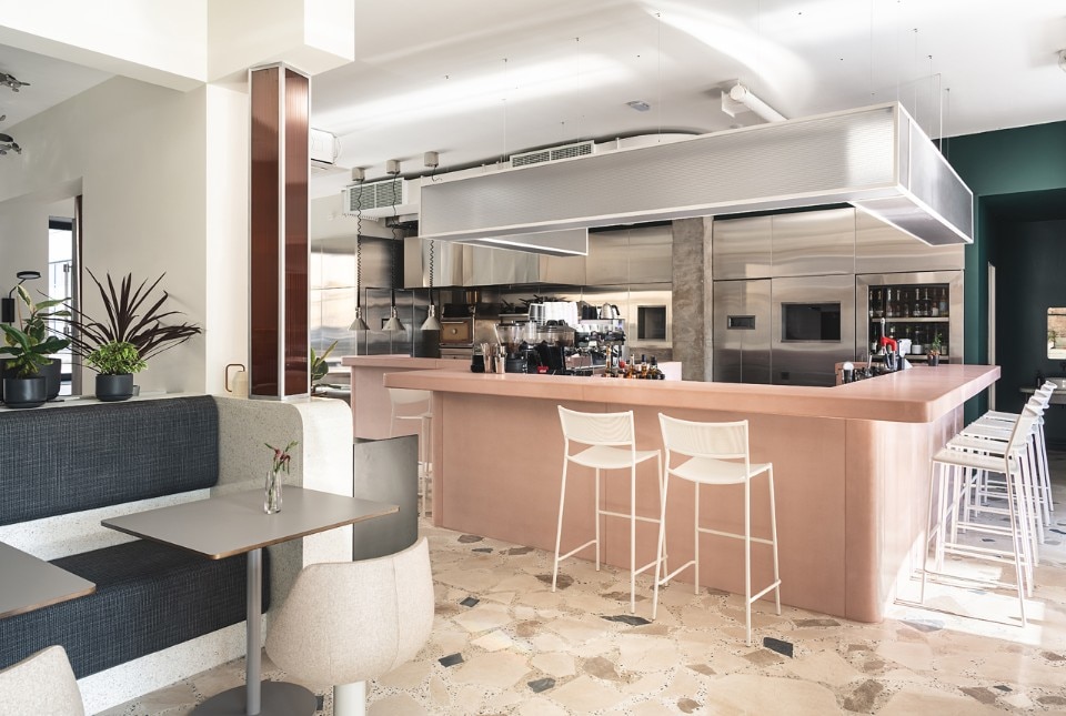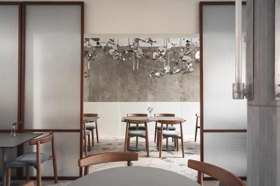 The 150 sqm area includes two rooms, a cafè and a dining room, characterized by the alternation of flat and cold colors - the pink bar counter and the white ice or petrol green walls - and mélange and material coverings, like the breccia floor or the wide sponged gray wall. The restaurant's ceiling is dominated by a metal garden sculpture that recalls the stainless steel of the open kitchen, while the shimmering and semi-transparent surfaces aim to dilute an elegant but austere composition dominated by a skin tone and winter palette.