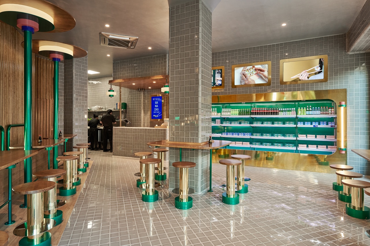 The Spanish studio Masquespacio designs Kento’s 4th Take Away shop’s interiors among gray tiles, wood strips and gold and emerald green finishes from the tables to the fridge.