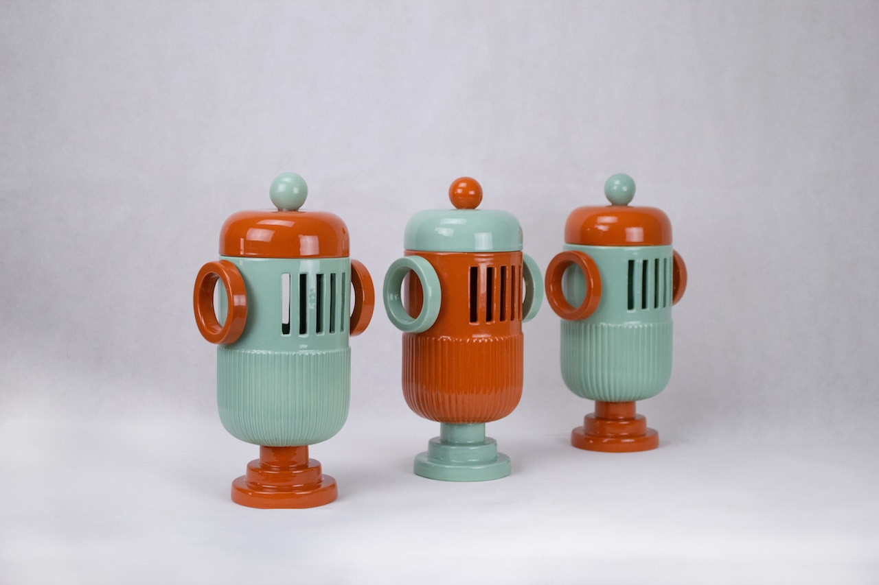 Among their most unusual objects we find the porcelain statue dedicated to Clementine Delait, the famous bearded lady who lived in the late nineteenth century and who made her physical ‘deformation’ her strenght, freeing herself from the aesthetic stereotypes of her time. Clementine combines modern and classical style, rethinking the role of sculpture today. From historical figures we move on to more traditional and timeless objects such as the Alfabeguer, or Albahaquera, a container for aromatic plants whose birth dates back to 1392. The version reinterpreted by Estudio Pot recalls a robotic aesthetic from the 90s with the contemporary colours of vermilion red and mint green. Coming up next is a collaboration with a fashion brand and ceramic production for a restaurant in Spain.
