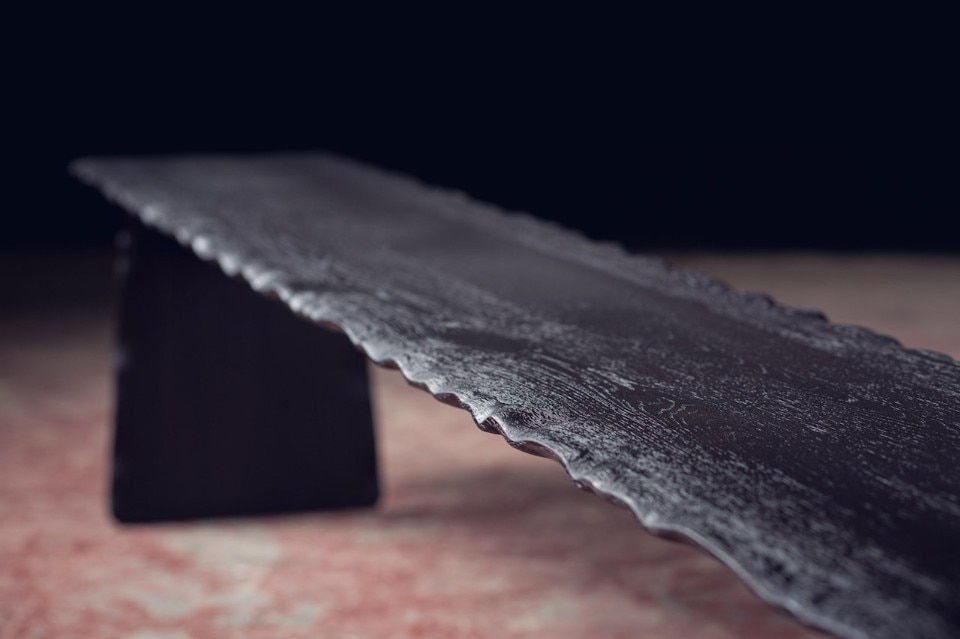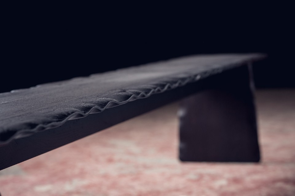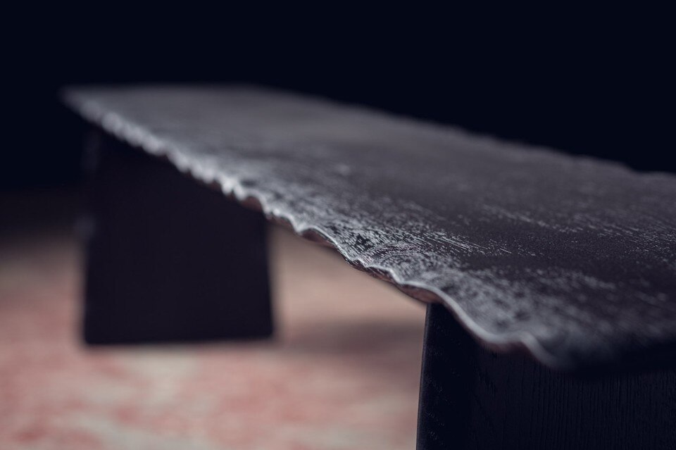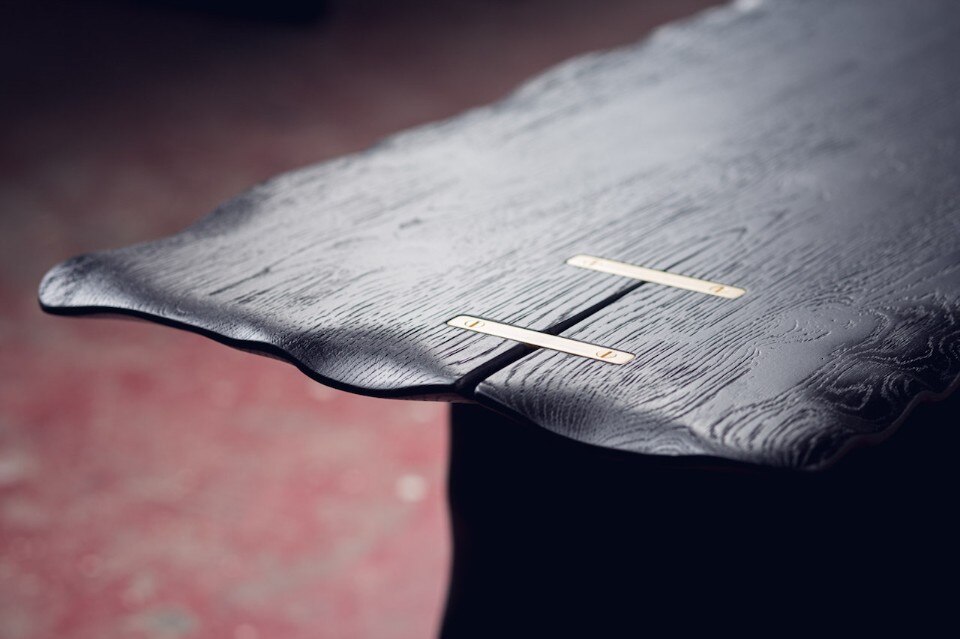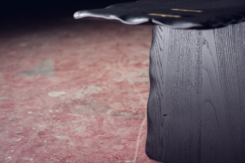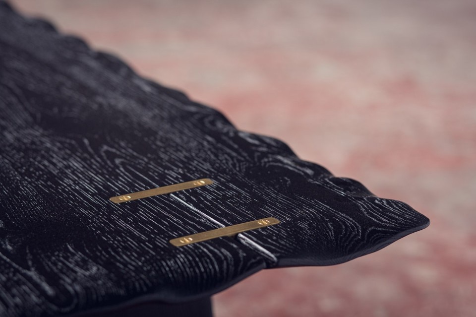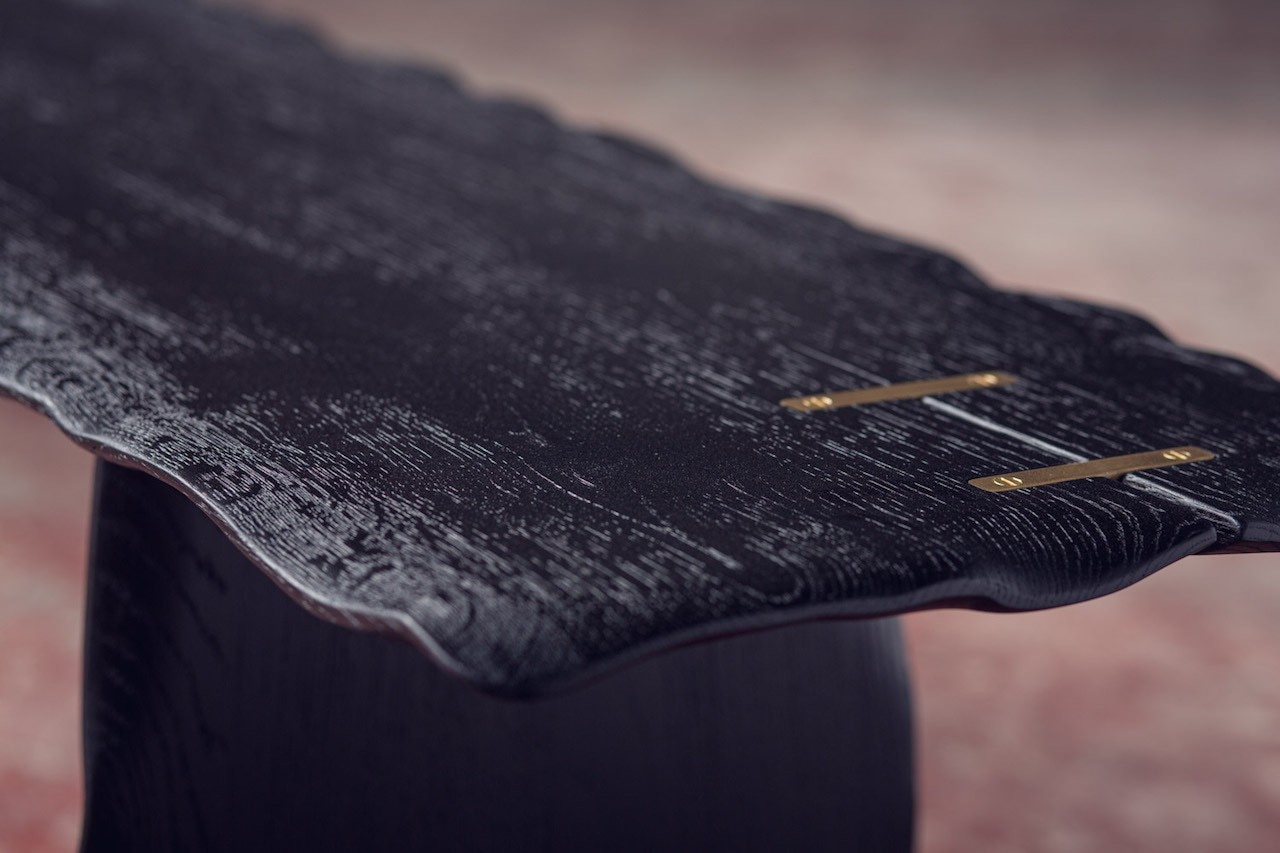 Alon Dodo’s creations include seatings, desks, beds and accessories, all hand made in his studio. In Flying Carpet, the surfaces of the table and bench – made respectively of massive white oak and massive blackened oak – have waving edges as they were moved by air. A brass inlay is placed on a crack of the wood to prevent it to expand and to underline its presence, as a sort of kintsugi. At the end the furniture pieces have been lacquered.