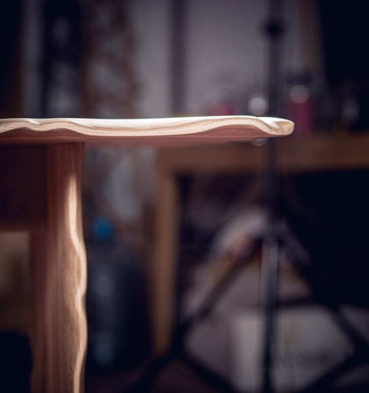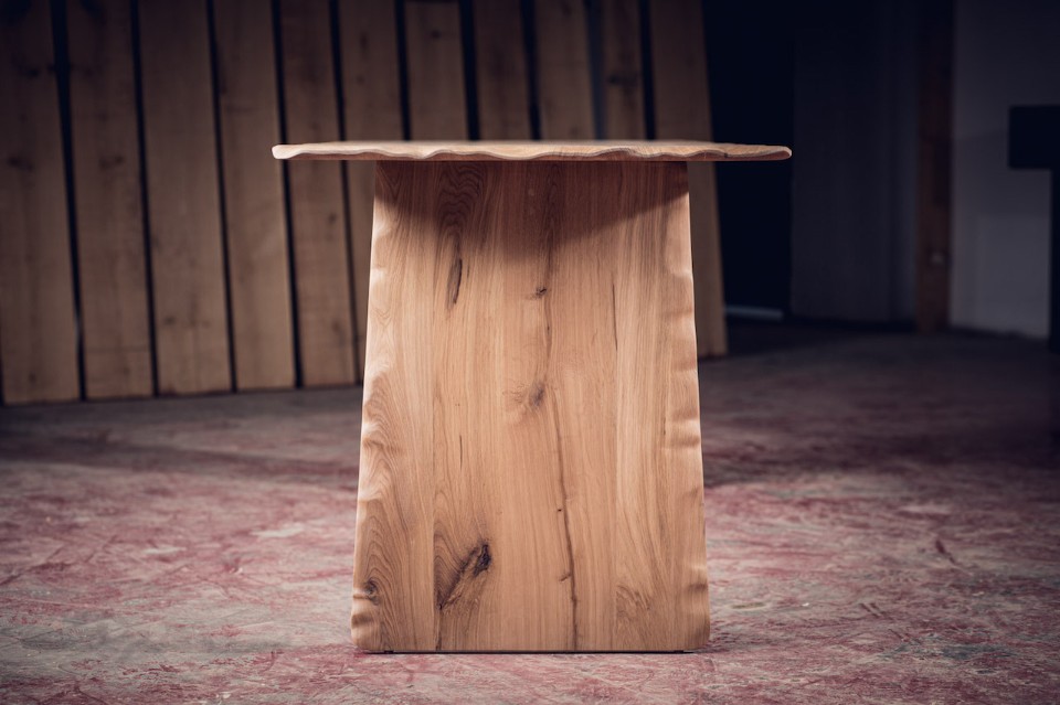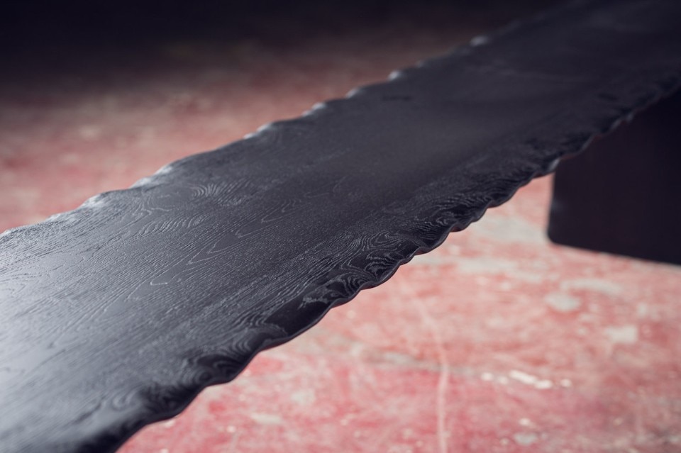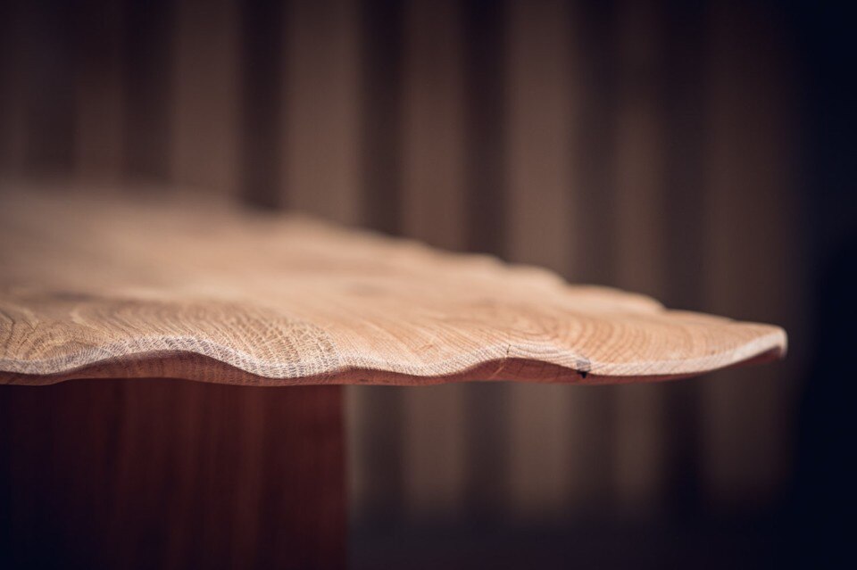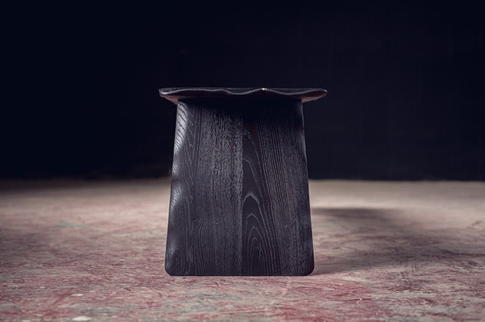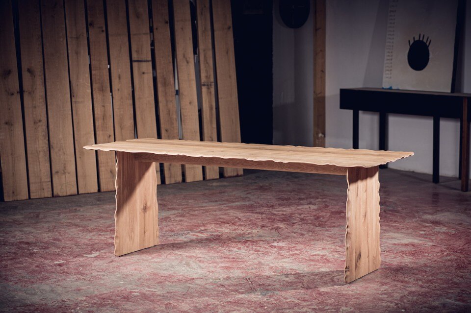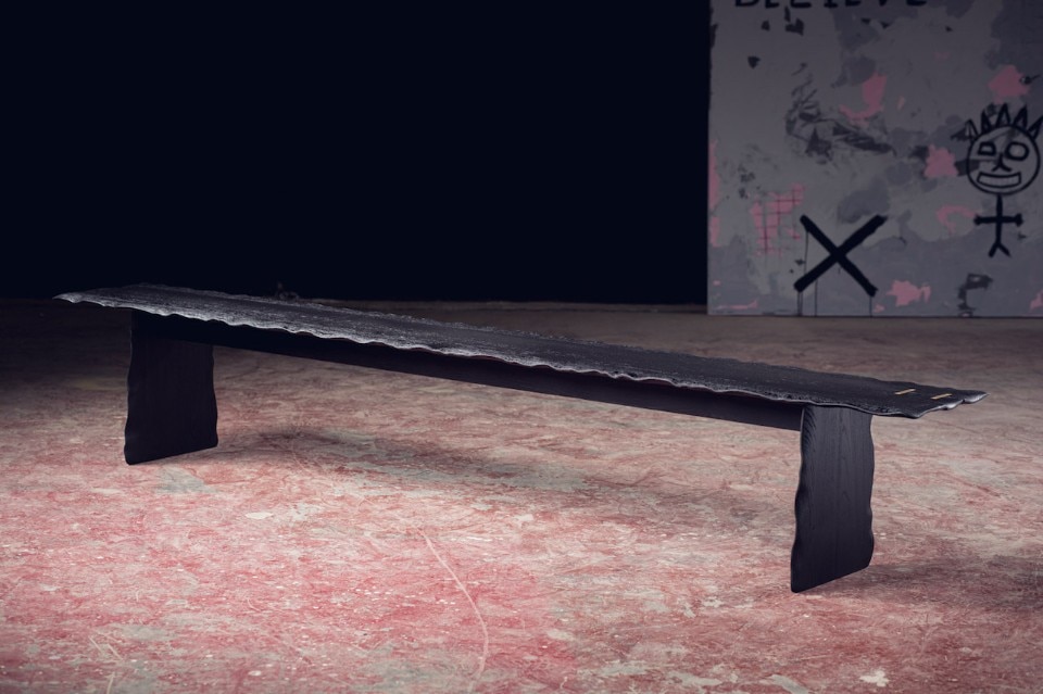 Alon Dodo’s creations include seatings, desks, beds and accessories, all hand made in his studio. In Flying Carpet, the surfaces of the table and bench – made respectively of massive white oak and massive blackened oak – have waving edges as they were moved by air. A brass inlay is placed on a crack of the wood to prevent it to expand and to underline its presence, as a sort of kintsugi. At the end the furniture pieces have been lacquered.
