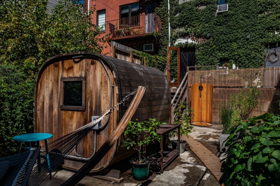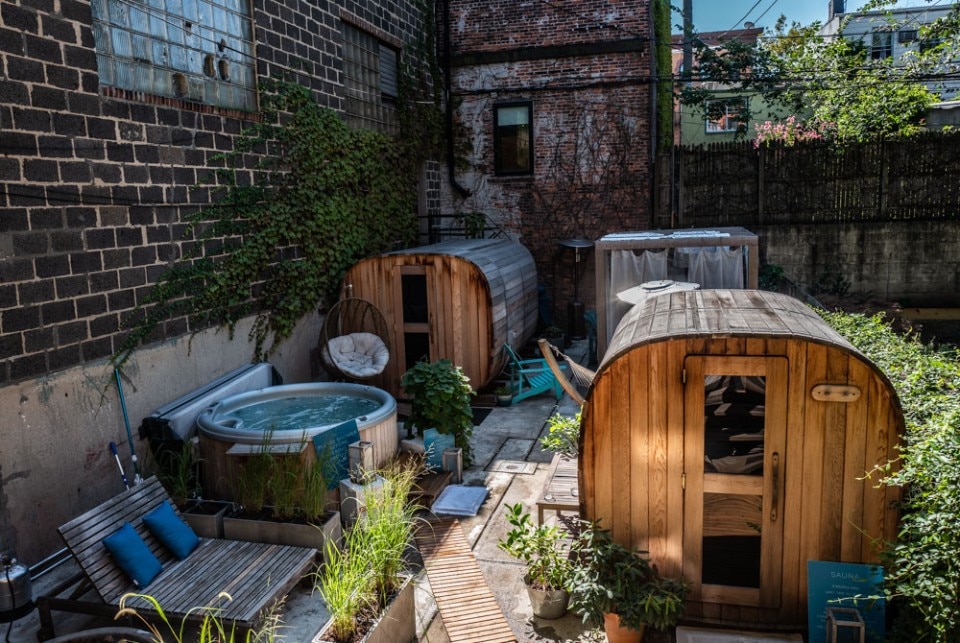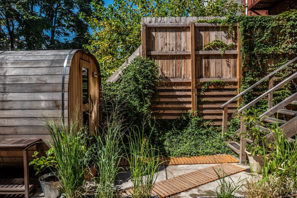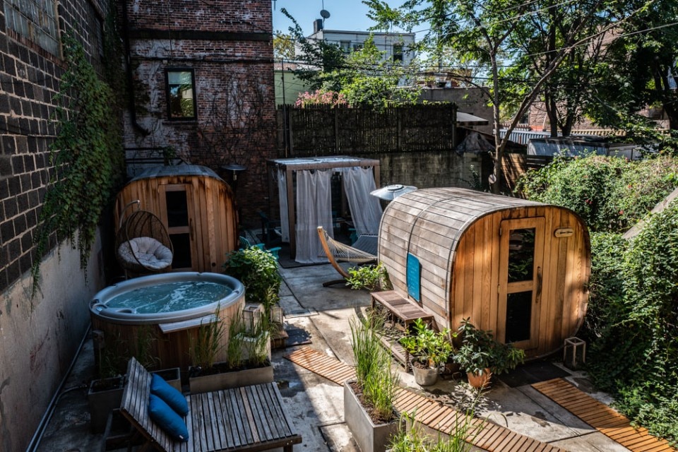 Visually, the most impacting elements are the two outdoor cabins made of cedar wood, used for sauna and displayed in the backyard of this former apartment transformed into a beauty centre: here, especially in summer, there are parties, meetings, yoga lessons and always sold out evenings of jazz and hydromassage.