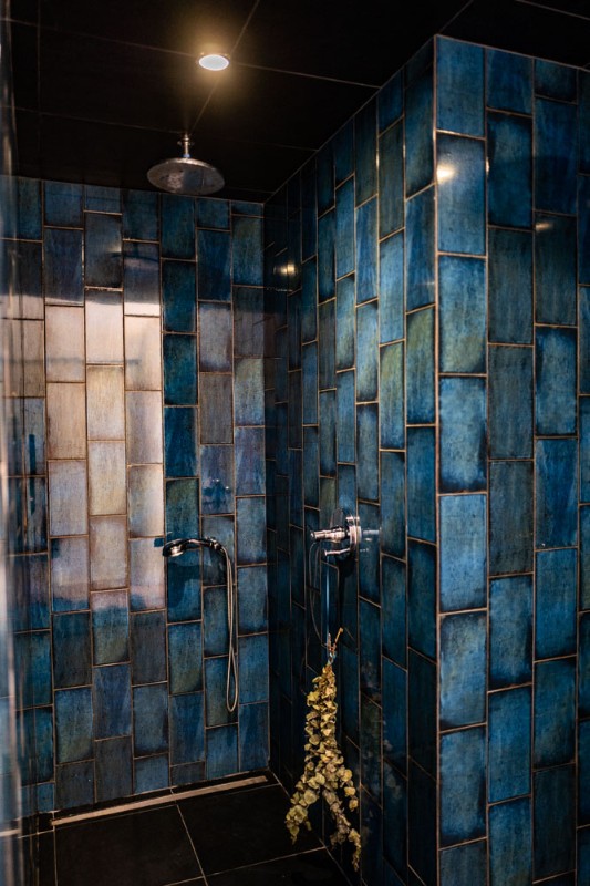 The materials are based on natural elements; the cork floor, an excellent insulating material with natural antibacterial properties, ideal for a damp environment; the blue ceramic tiles on the walls of the showers are reminiscent of water and the black ceramic floor and ceiling wants to recreate the feeling of being in a cave; the concrete sink echoes the stone; the walls are plastered; original metal tiles on the ceiling and around a pillar, used in the last century as a precaution against fire, have been preserved and repainted in white, showing the past of the place.