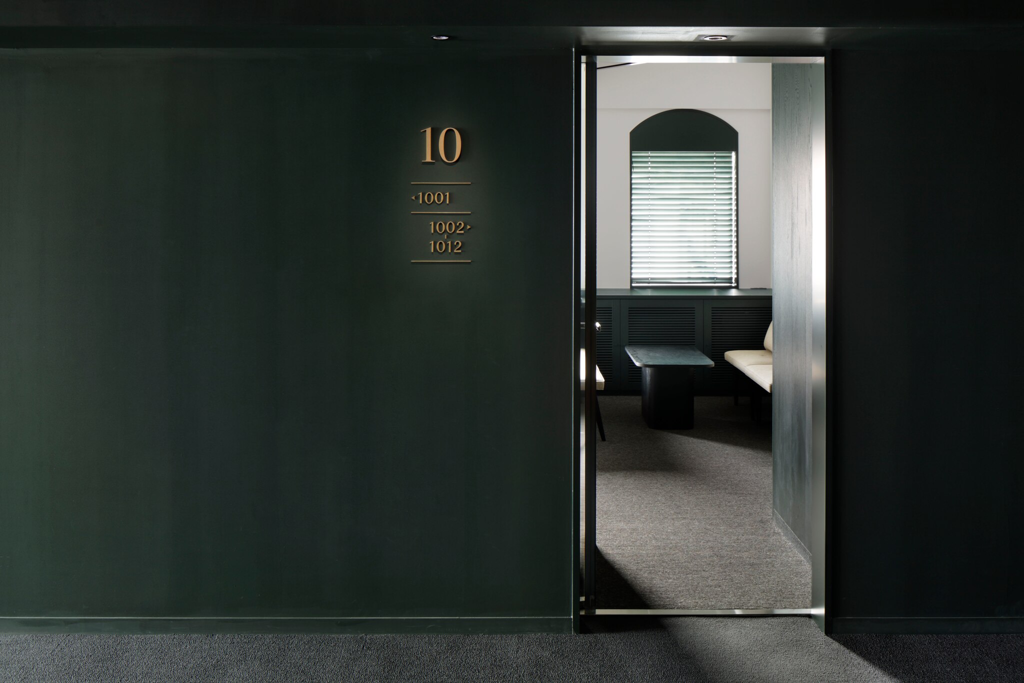 From the 3rd floor upwards and in contrast with the two levels below, the idea of a relaxing and resting space was strengthened. In the guest rooms, the original arched windows give both a delicate aesthetic connotation and a new affinity with the external urban context. The function of each room is kept to its minimum and elegance. The furniture pieces are transformed into a unique green boiserie that highlights the spaces and hides the services of the room through sliding panels.