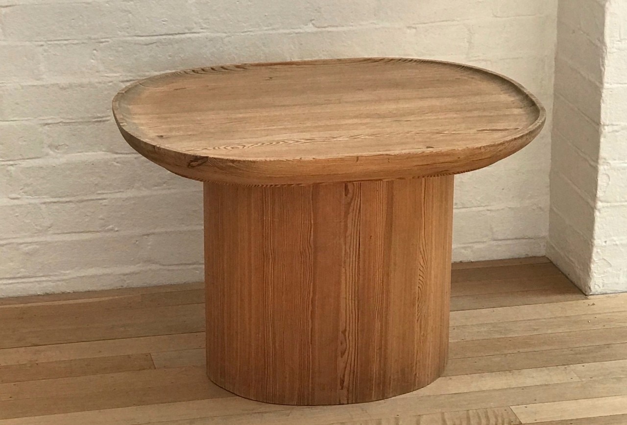 The piece is anything but typical in form, consisting of a straight-sided oval column as a base with a larger oval wooden tray sitting on top of it. The effect of these two forms combined is powerful and satisfying at the same time. Modernised, rural craft without sentimentality or ornament. It is unobtrusive and yet has a powerful presence. 1930s Super Normal. As Enzo Mari says, “Being not seeming.”