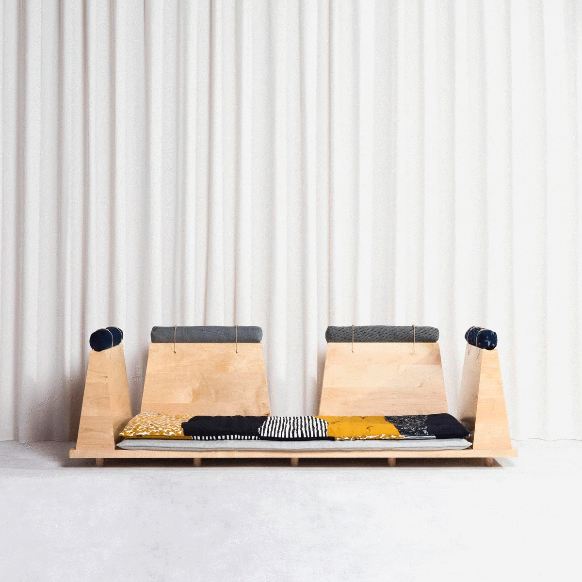 The wooden skeleton is designed as a frame to hold a variety of traditional cotton items, and can be customised through a modular system of wooden dividers, cushions, futons and zabuton – the padded layer under the futon. Starting from a wooden plinth, the four elements can be added in various combinations, producing a flexible system that can be modified during use.