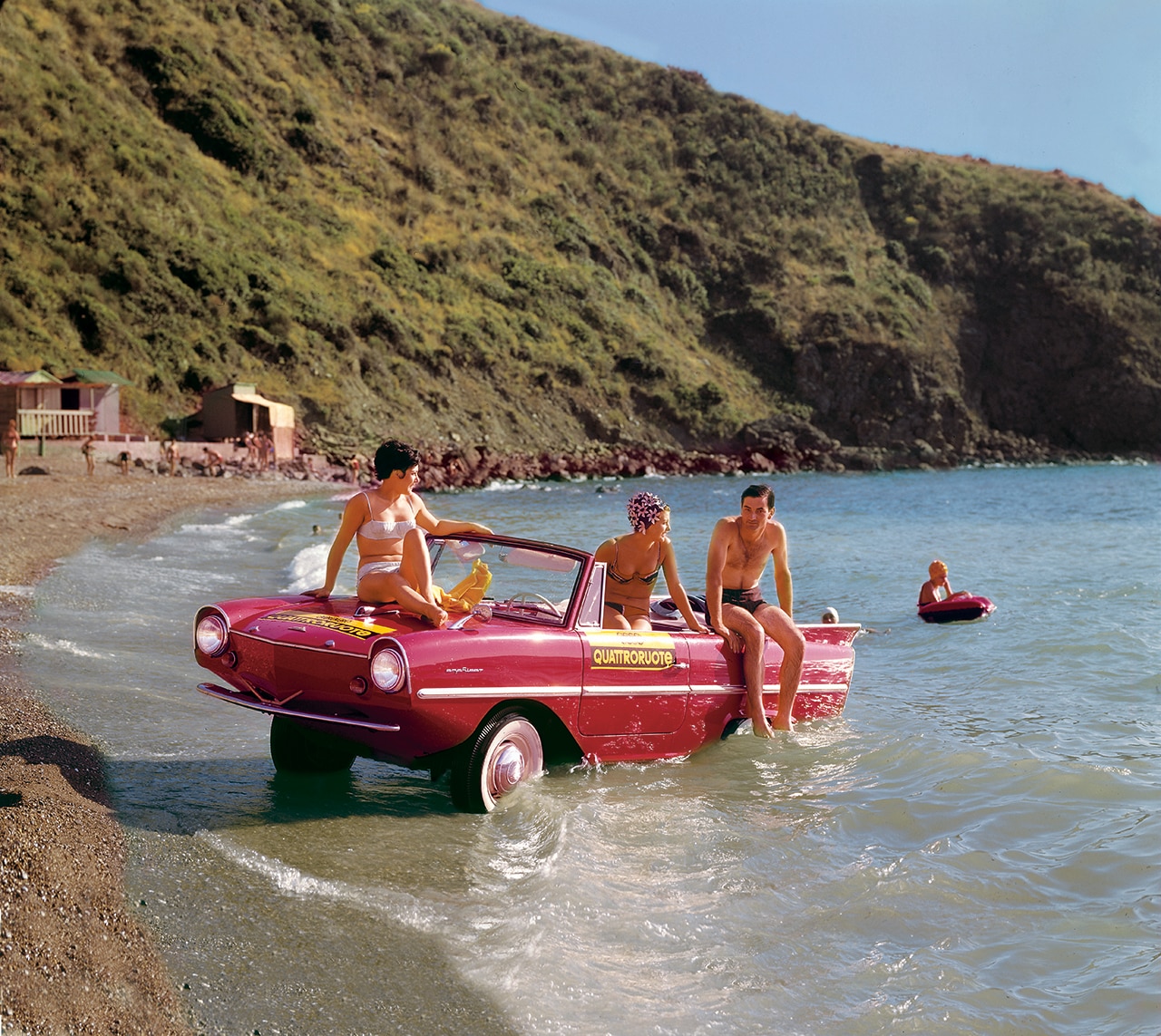 Almost 4,000 Amphicar were produced between 1960 and 1965, a remarkable figure for a truly atypical model. It was the invention of German engineer Hans Trippel, the very first designer to conceive a car which could both ride on dryland and navigate. While other spiaggine would stop on the shoreline, the Amphicar could sail in open waters: it did so, for instance, in August 1965, on the very summery cover of Quattroruote 166.