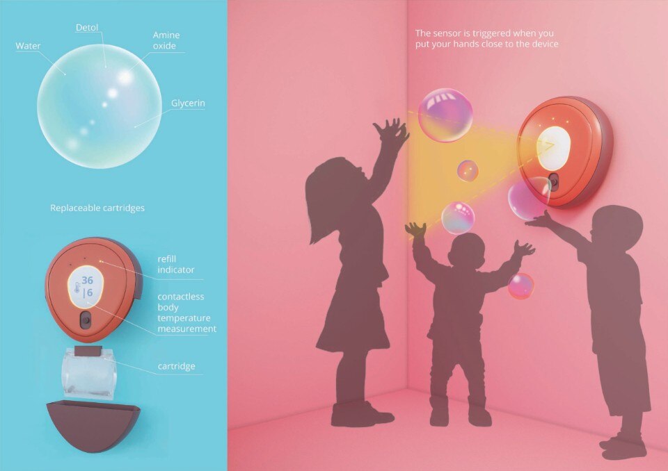 Five projects selected in this special edition of jumpthegap are: Bubble Bump, an instrument that automatically releases a liquid disinfectant in the form of soap bubbles to ensure that children can clean their hands with a moment of play; E-Tapis, a device to clean the soles of shoes using liquid disinfectant and UV light; Lux, disinfection system for public bathrooms with UV light; OM, sanitary totem that offers both a hydroalcoholic disinfectant gel dispenser and an infrared thermometer; UVClean, tap equipped with UV light cabin to disinfect objects such as smartphones and keys while the user washes his hands.