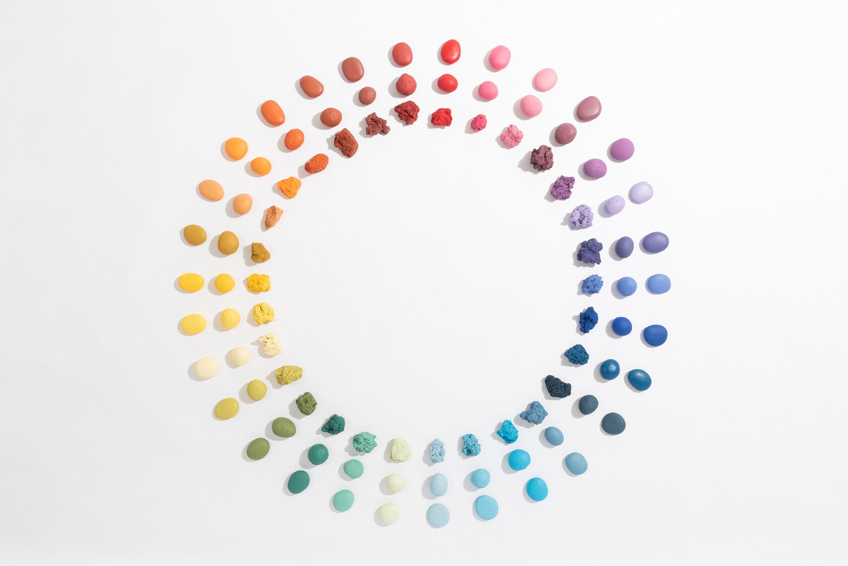 The 90 stones of the wheel are divided into 30 different colors and three types of surface, to show how the color changes depending on the incidence of light on each surface. Depending on the roughness on which the light is reflected, it will create reflections or shadows. The system is, therefore, divided into three levels: the first is represented by flat surfaces where shadows and light are more evident on the curvatures, the second is an intermediate point, having a continuous surface with small defects and the last, instead, exemplifies the color in a rough surface where the light passes through the different holes of the stone.
