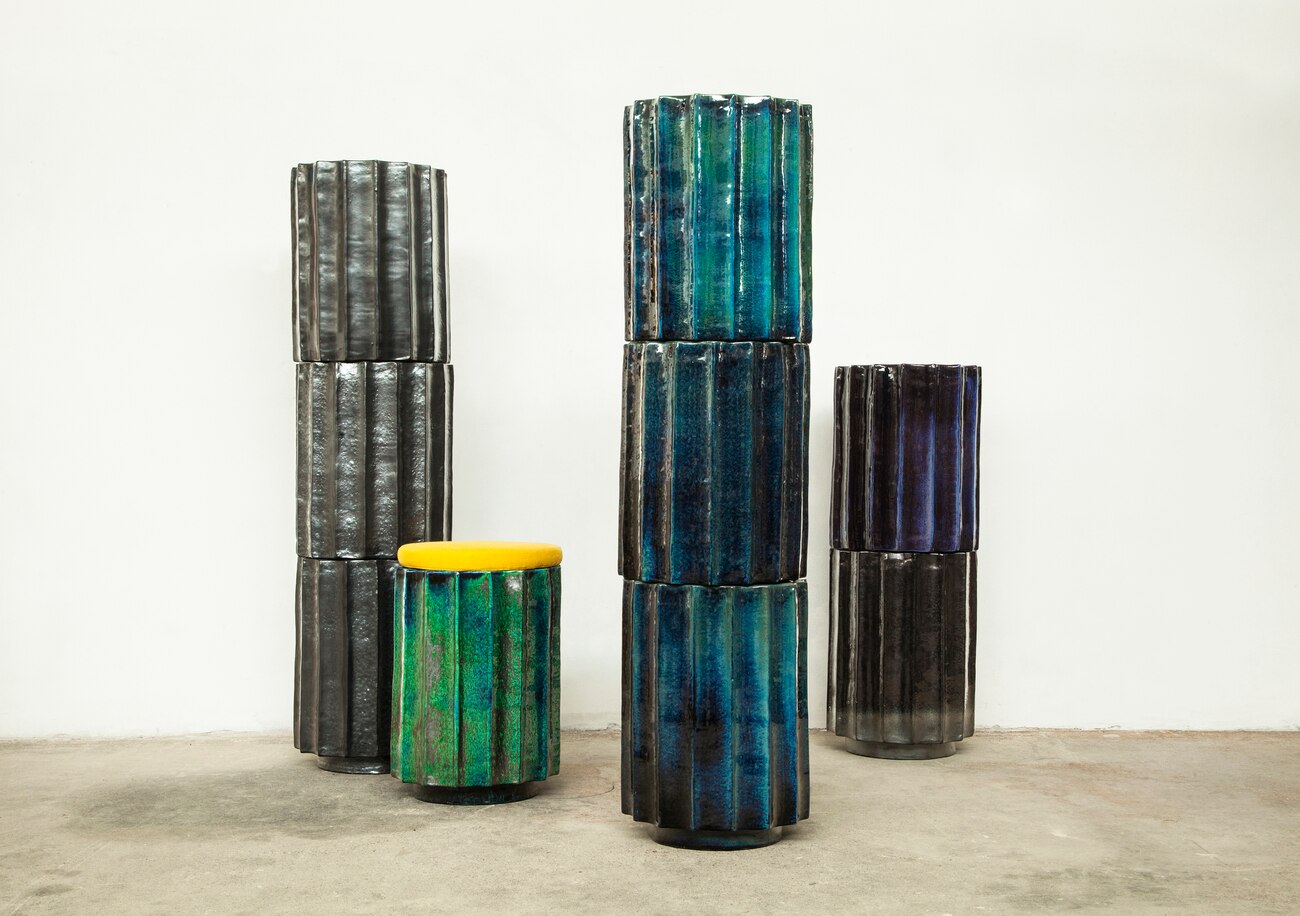 In the mid-18th century Gian Battista Piranesi engravings invented landscapes made of dramatic details and strong contrasts, mixing together the real and the fantastic, classical ruins with ancient monuments and the architecture of the time. This is the inspiration behind the Stele line of stools, a project resulting from the collaboration between the multifaceted American-born artist Niccolò Morgan Gandolfi and the Bologna-based design team Doodesign. Gandolfi works with natural elements and traditional materials, creating a bridge between past and present. The seats take the form of ancient ruins scratched by the patina of time which, stacked one on top of the other, form real columns, as if we were among the ruins of an ancient theatre. Entirely terracotta handmade, they have an internal structure in perforated phenolic wood to ensure breathability and durability over time. The stools are coloured in iridescent shades and crowned with soft cushions in cotton, silk, linen and velvet.