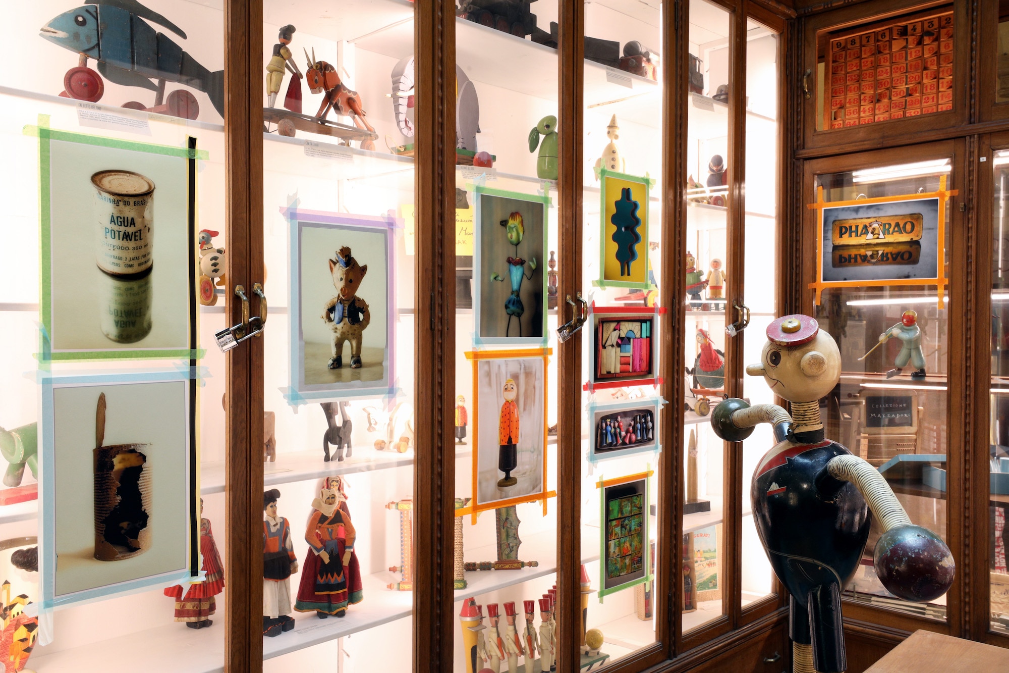 Detail of Joe Nemeth’s photographic installation on Giovanni Michelucci’s cherry wood and brass console table for the Cassa di Risparmio di Firenze, 1953/57); selection from the Maurizio Marzadori Collection of Design for Children, Bologna (in the showcase inside the console table); Dado Arrigo, Corriere dei Piccoli character and mascot of the Arrigoni stock cubes company (left); Freak Andò, Antiquariato Modernariato Arte Design, Bologna.