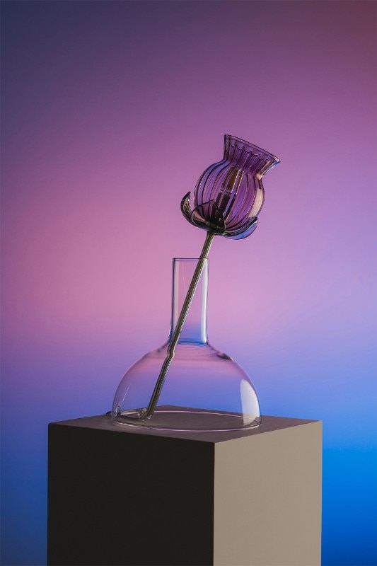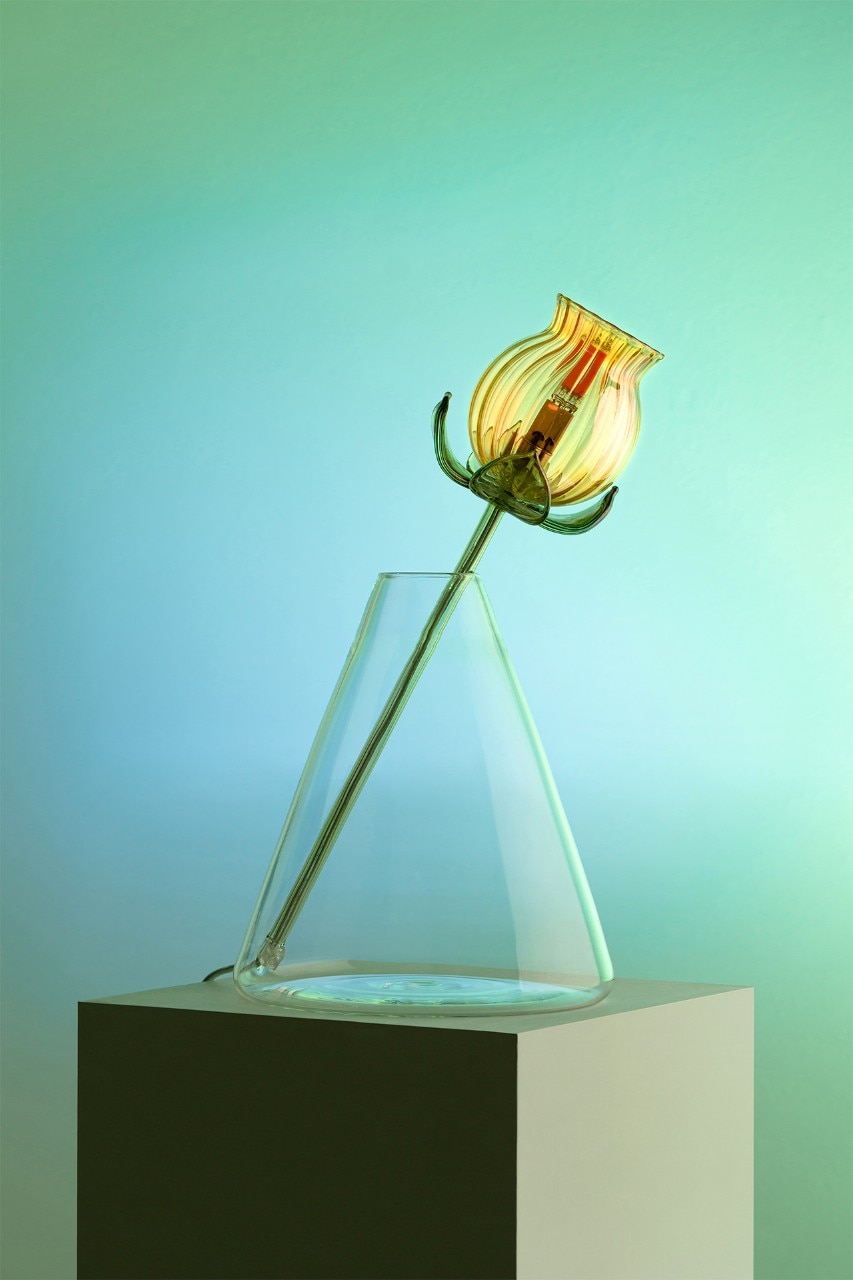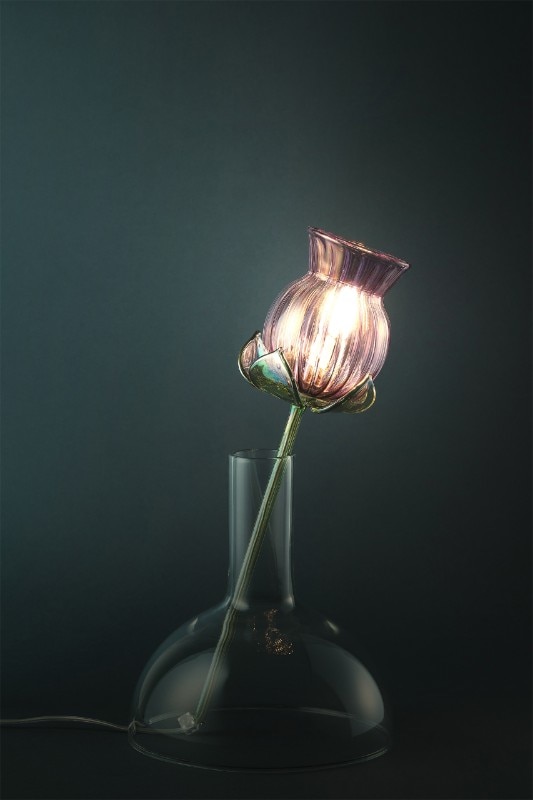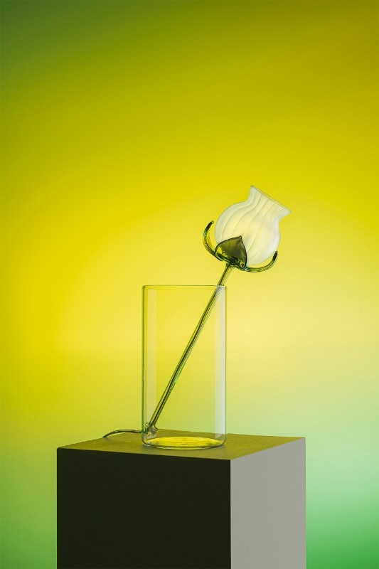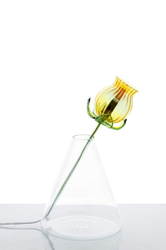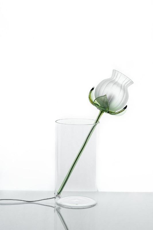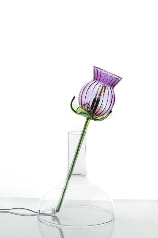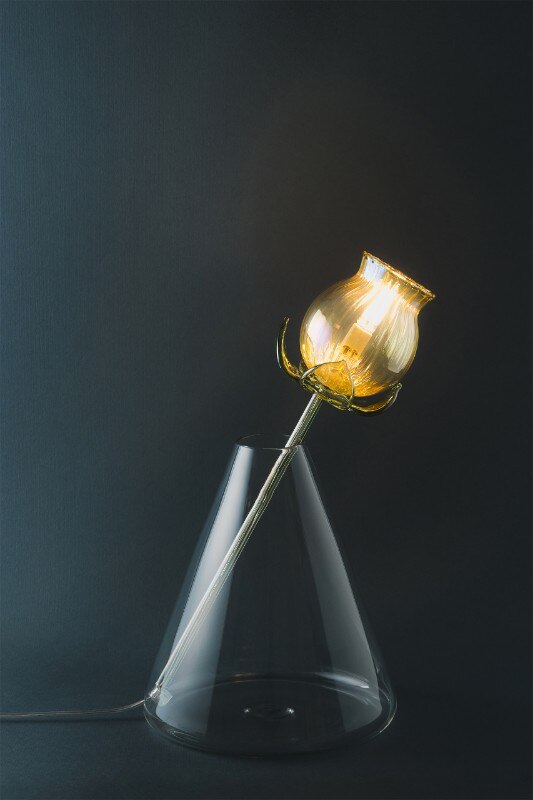 Alessandra Baldereschi continues her research into glass, one of the materials she has been working with in recent years, with a collection of table lamps. Delicate glass corollas of different colors carrying an LED bulb to act as a pistil, threaded through vases of different shapes depending on the color of the corolla.