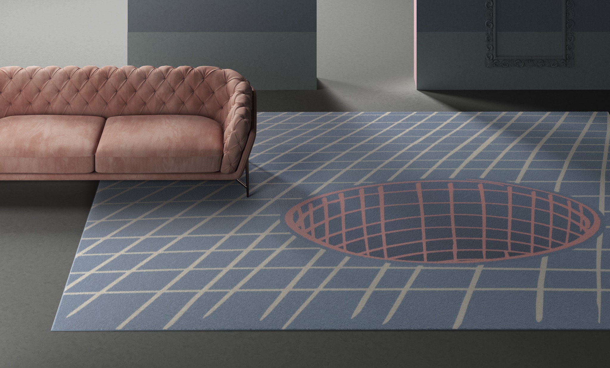 “Playing with perspective means that from certain points of view, when you look at the carpet, the perspective effect won’t work,” explains the designer. “In that case the carpet will be seen more as a graphic element than a dynamic one, but that is fine: it’s part of the game.” The second collection, Stacked-Up, plays with three-dimensionality and represents a series of stacked metal panels emerging from the carpet level thanks to optical illusion, and unexpectedly assuming a new value.