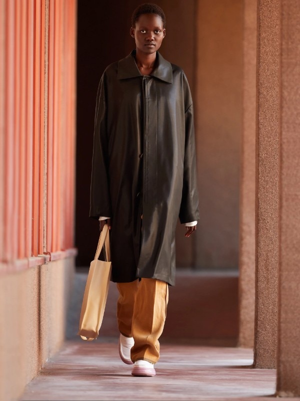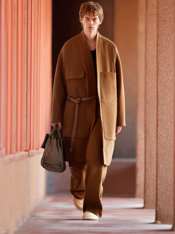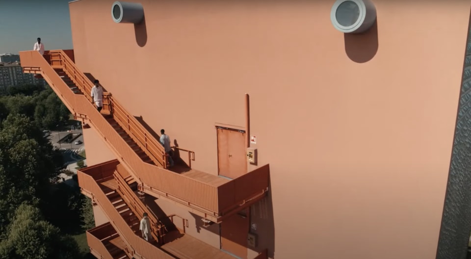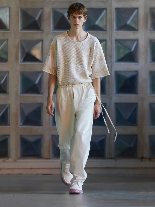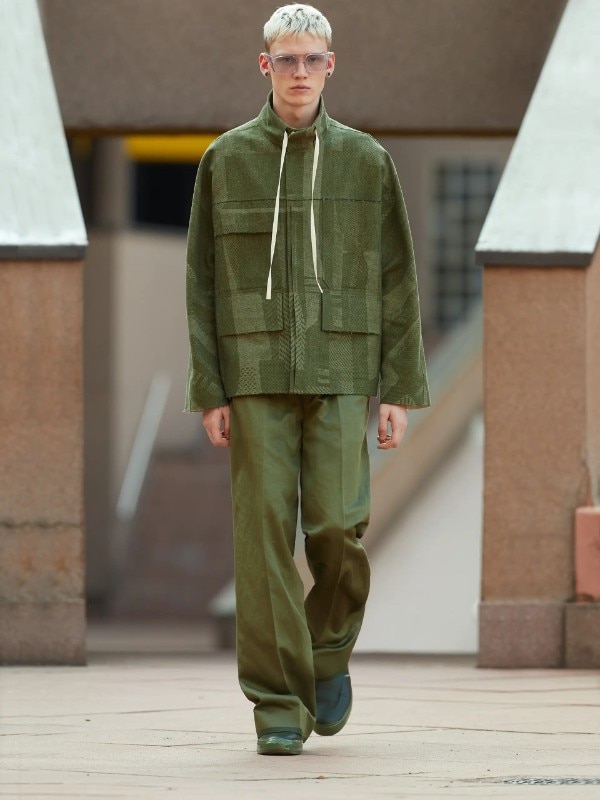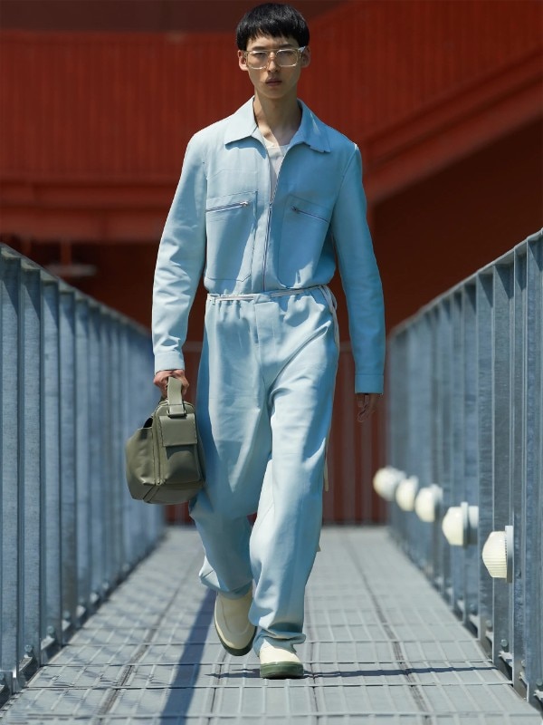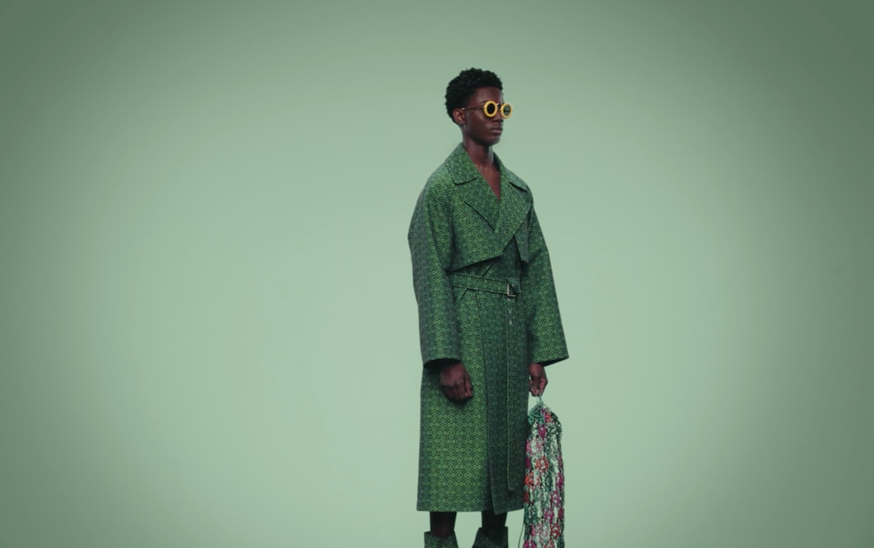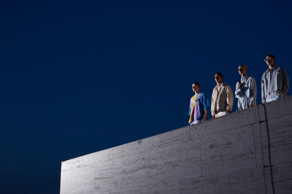 Directed by Alessandro Sartori, Ermenegildo Zegna’s collection is marked by aesthetics and functionality, reflecting the archetypal model of the work uniform. The video first shows the models running through a labyrinth in the large park surrounding the Masino castle in Piedmont and then through the stairs of the new IULM building in Milan and the amphitheatre of the Gallaratese residential complex by Carlo Aymonino and Aldo Rossi. The show then concludes with a shared dinner on the water in the Rho Fiera area. Collarless kimonos, utilitarian coats, long duster coats, oversized shirts parade among the architecture in a short film that overlaps freedom and constraint, natural and concrete.