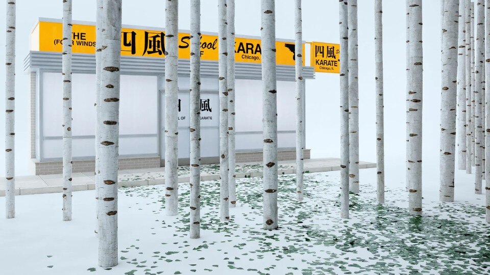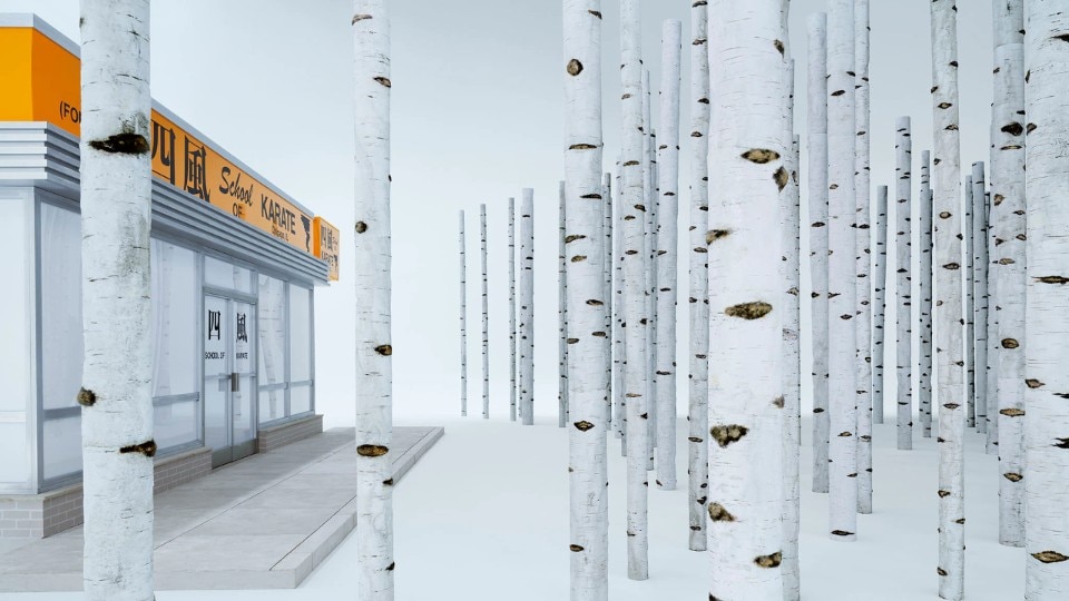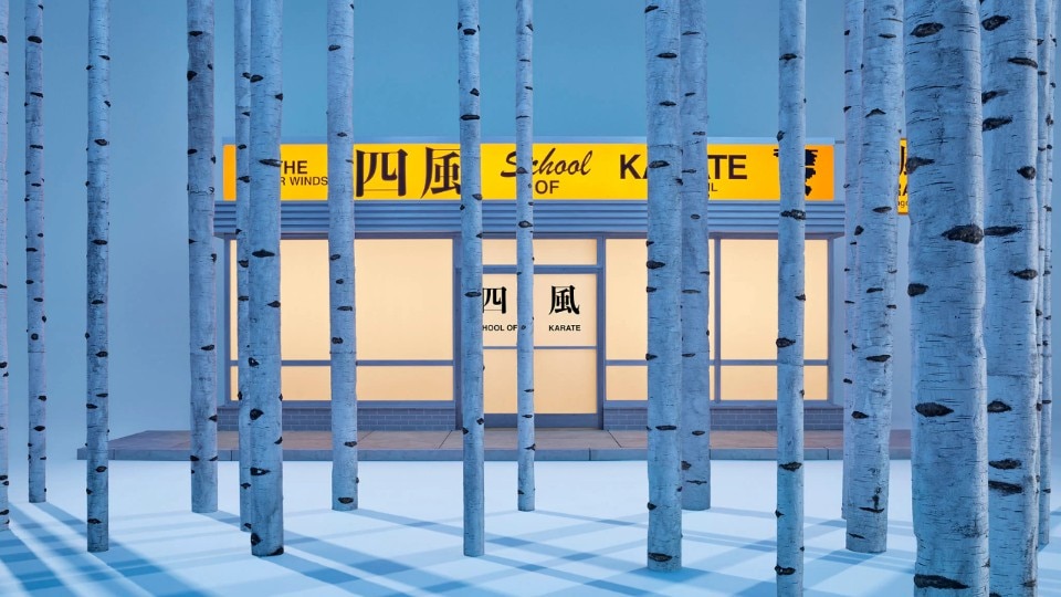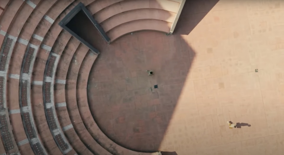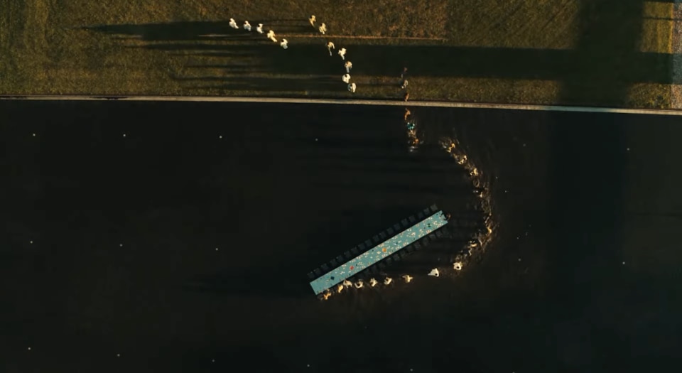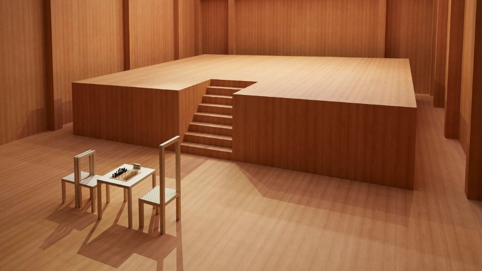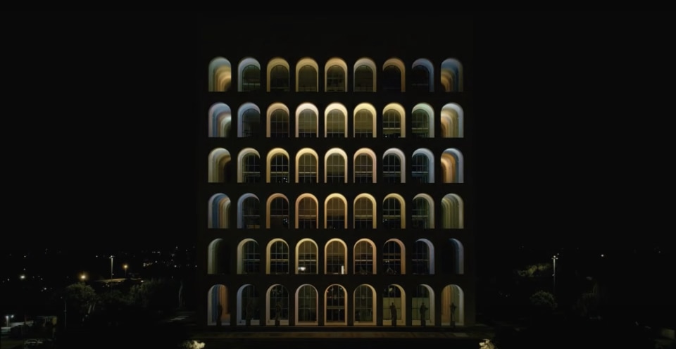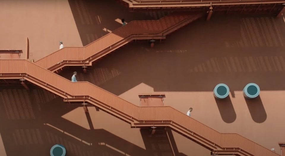 Directed by Alessandro Sartori, Ermenegildo Zegna’s collection is marked by aesthetics and functionality, reflecting the archetypal model of the work uniform. The video first shows the models running through a labyrinth in the large park surrounding the Masino castle in Piedmont and then through the stairs of the new IULM building in Milan and the amphitheatre of the Gallaratese residential complex by Carlo Aymonino and Aldo Rossi. The show then concludes with a shared dinner on the water in the Rho Fiera area. Collarless kimonos, utilitarian coats, long duster coats, oversized shirts parade among the architecture in a short film that overlaps freedom and constraint, natural and concrete.