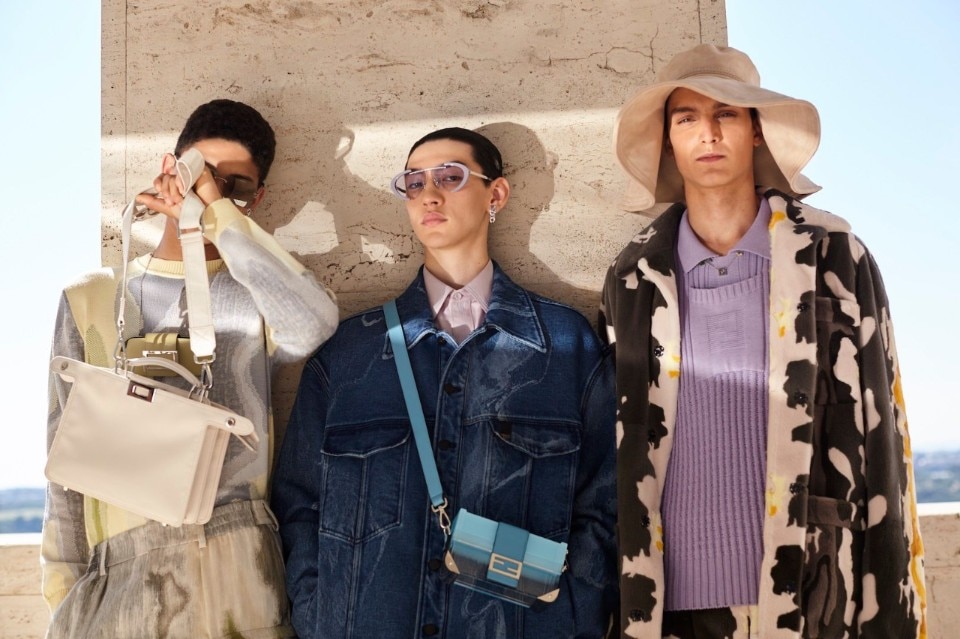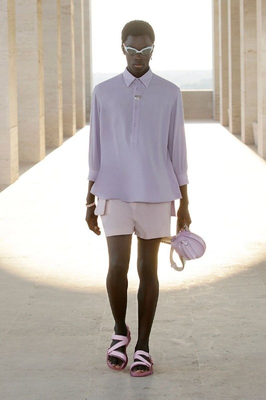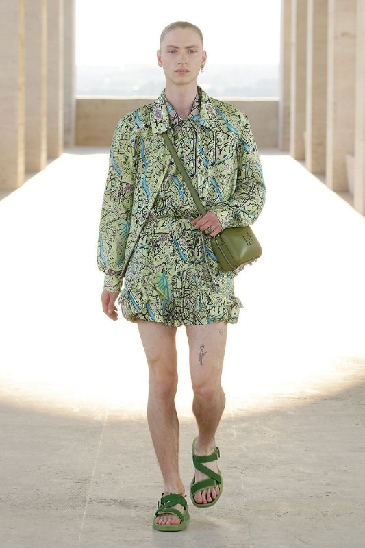 When our city and our personal spaces statically condition our imagination, Silvia Venturini decided to dedicate an entire collection to the eternal city, shooting the whole short film inside the monumental EUR, Palazzo della Civiltà Italiana as well as the brand’s headquarters. With the seven hills of Rome as a perspective, Nico Vascellari told the sense of freedom and lightness of the collection – from loose silhouettes and cropped jackets in pastel tones to long shirts worn with bare legs, from transparent trench coats to shorts with pocket details – using the elevated arcades and the roof of the rationalist architecture as a catwalk. The consecration of Rome, also returns as a texture with the graphic Fendi Land, a stylized plan of the capital, and Fendi Earth, a more abstract topographic version with sharp contours.