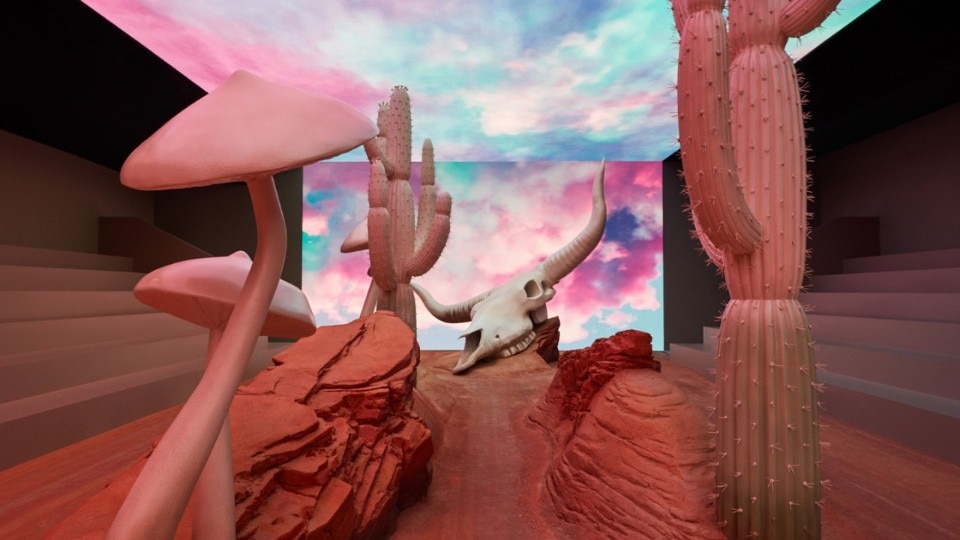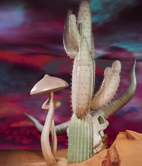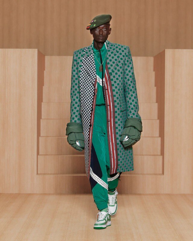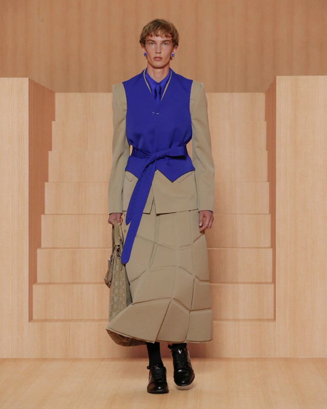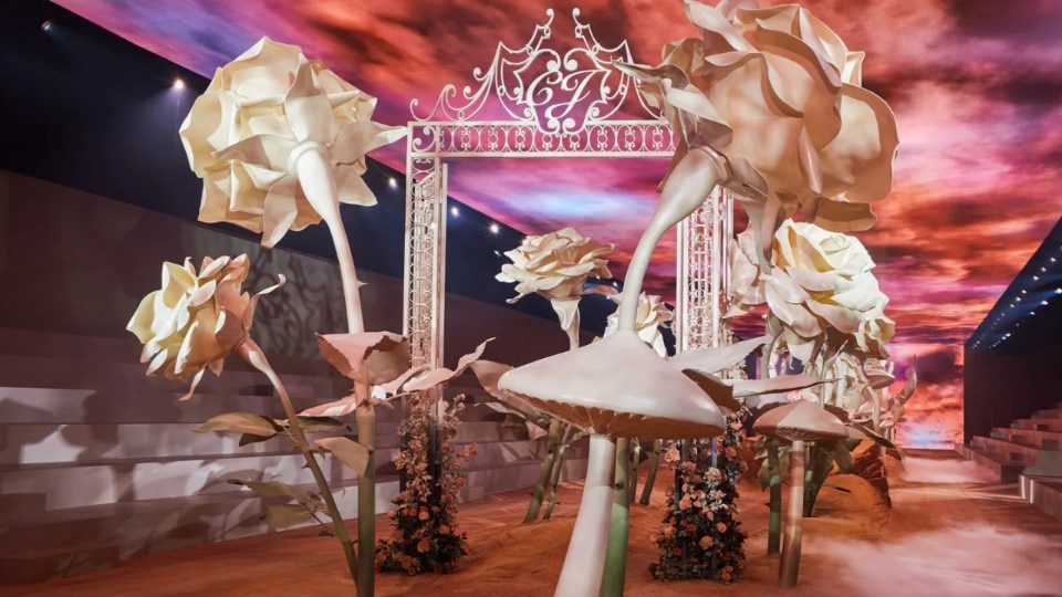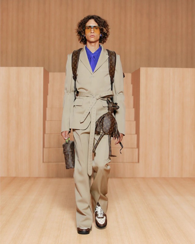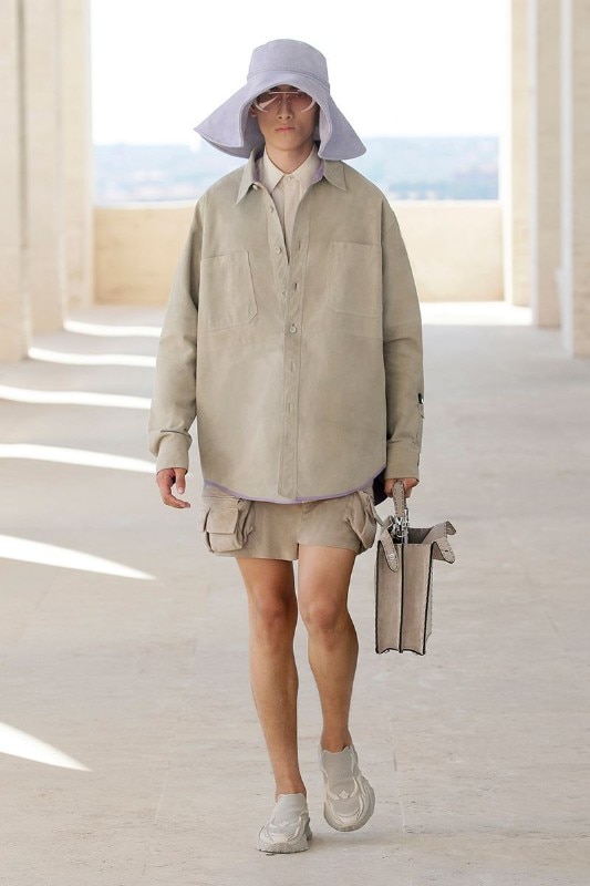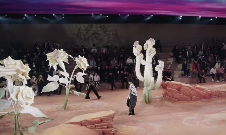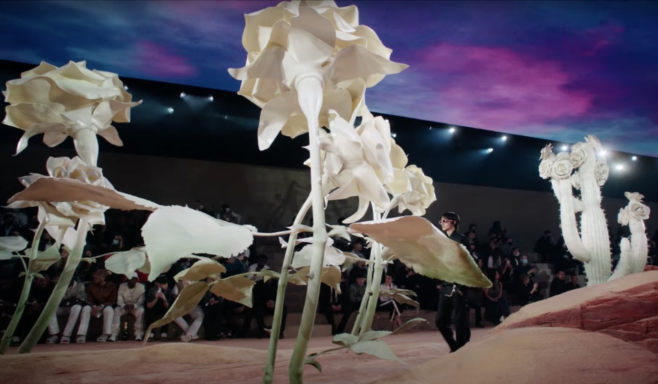 Kim Jones starts from an episode in the life of the founder, Monsieur Christian Dior, who, in 1947, a few months after his first collection, left for the United States and went to Texas. Accustomed to the rose gardens of his birthplace in Granville, the American landscape struck him with the difference in the manifestations of nature. From here, the brand celebrates its return to the catwalk with a collaboration with rapper Travis Scott, a rapper, composer, and music producer from Houston, Texas. In Paris-Texas (quoting Win Wenders’ cinematic masterpiece), the models appear in a desert landscape, populated by a buffalo head, cacti, roses, and giant mushrooms, where Christian Dior’s Granville memories and memories Travis Scott’s Texas encounters contribute to a dreamlike set.
