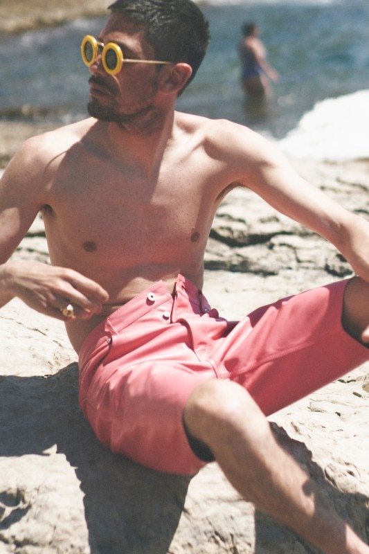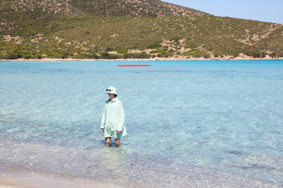 Presented again in video format, Miuccia Prada and Raf Simons tell us about “the utopia of normality” with their summer collection. AMO has imagined as a scenography for the occasion a red and winding tunnel, an escape route that ends in a space where nature and artefact interact. At about two minutes from the beginning of the video, the models reach the beach, among the clear sea and warm sand, scenes shot in the south-eastern tip of Sardinia, on the coast of Capo Carbonara, where the Maison is also funding the reforestation of marine ecosystems. Lying on the sand among granite boulders and floating red platforms, the models – almost all of them featuring the bucket hat with almond brims and triangular pockets with logo on the back, the collection’s signature piece – enjoy the uncontaminated landscape: a surreal encounter with nature and an unexpected beach infrastructure.
