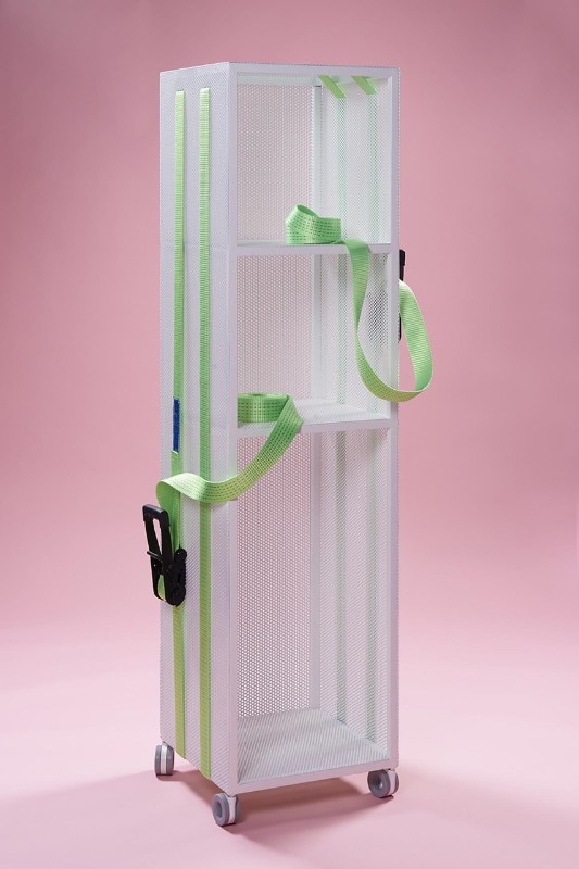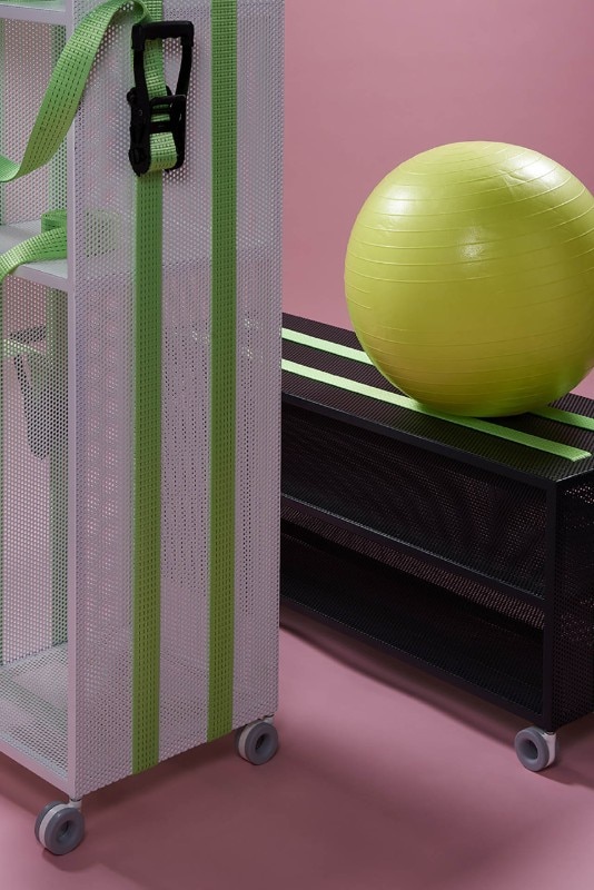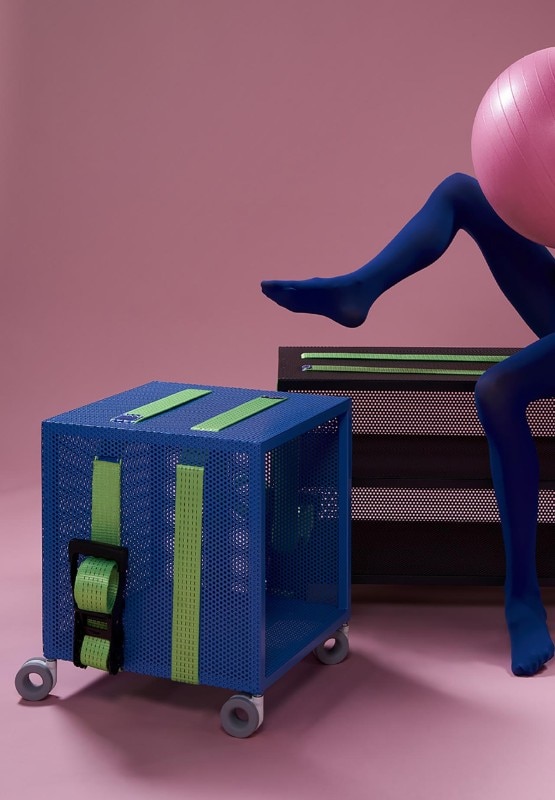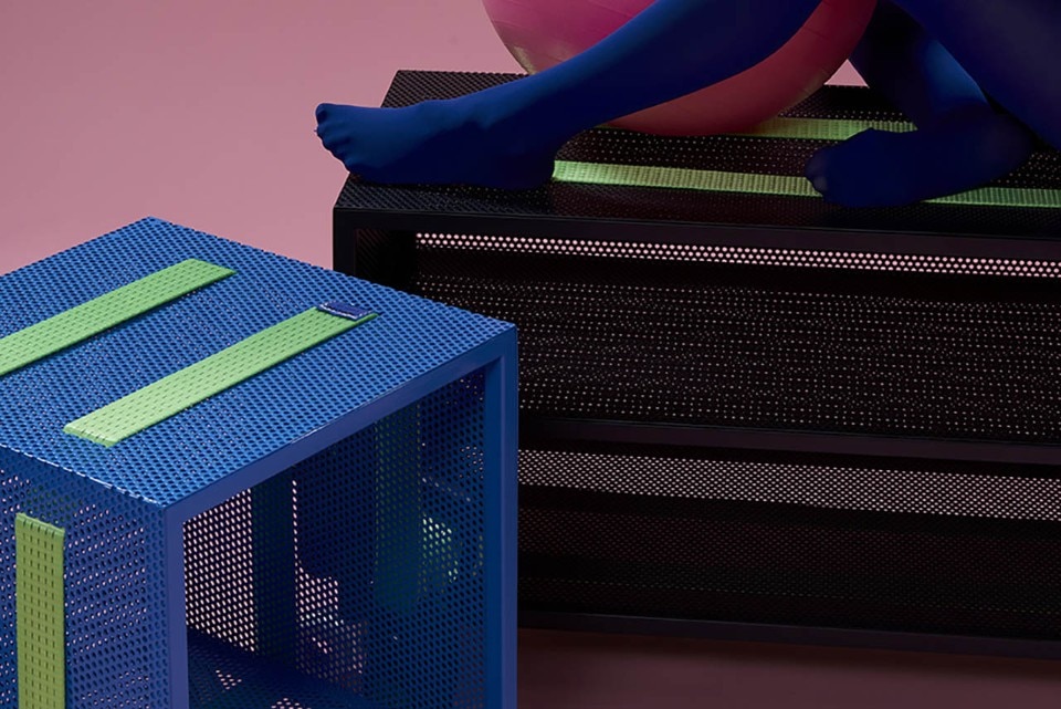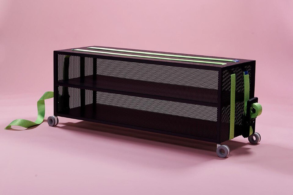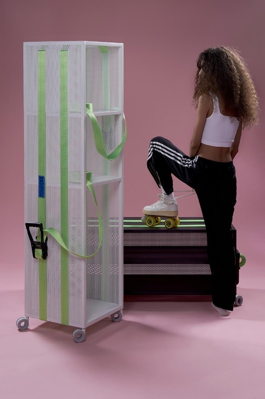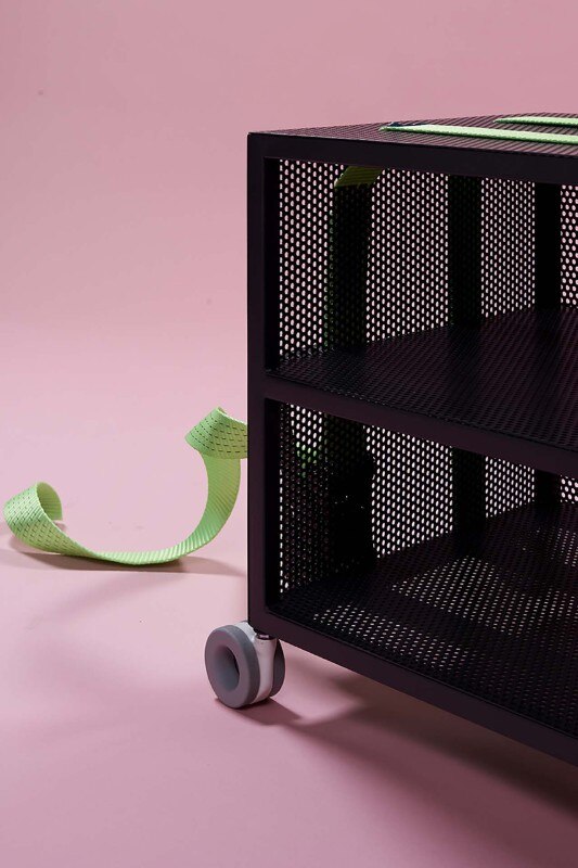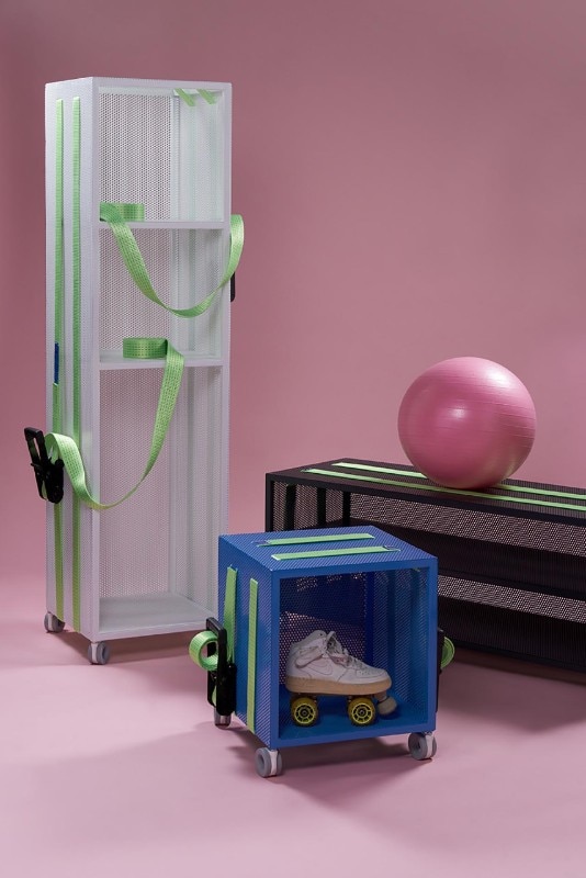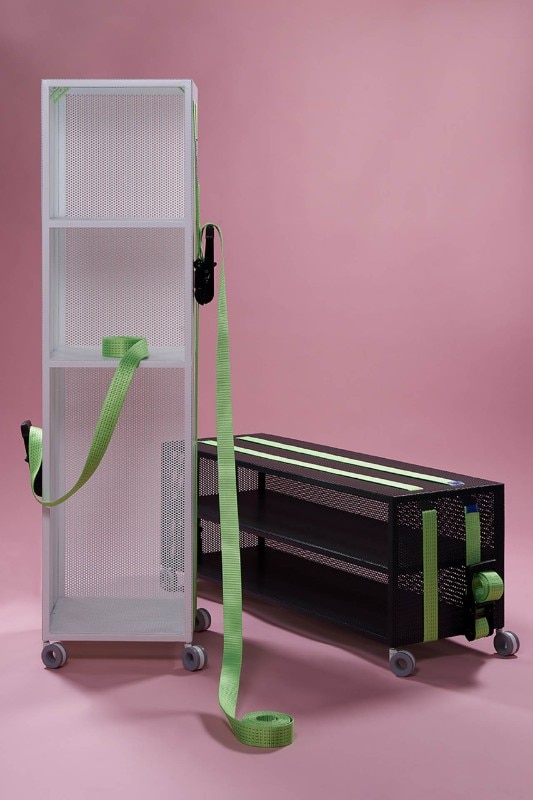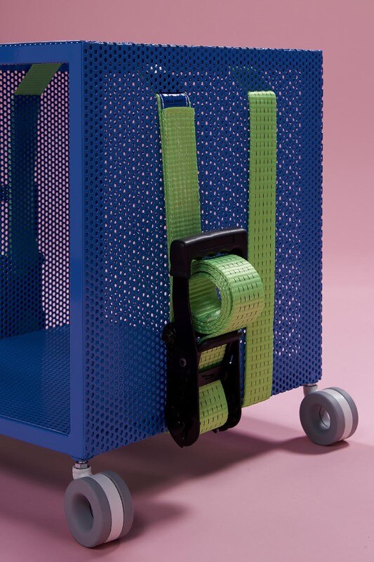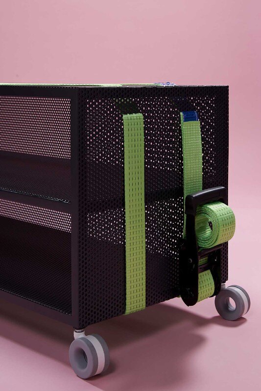 With the boundary between residential and working spaces increasingly blurred, the need to make furniture more versatile is growing. Claudio Larcher interprets this desire for freedom in his own way: using two components of clear industrial origin, the strap and the perforated metal sheet, the designer conceives three pieces equipped with wheels that take up the DIY aesthetic yet enhance it thanks to the chromatic contrast between the elements.