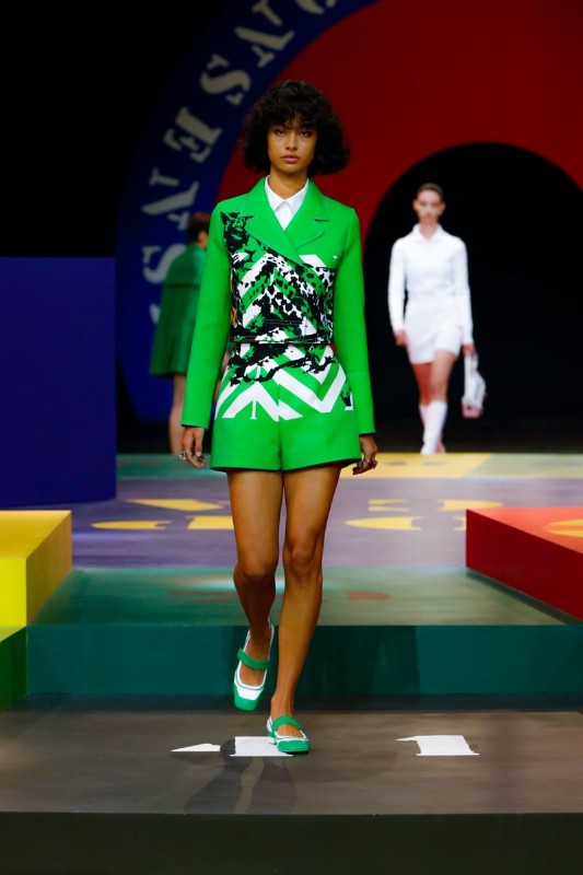The Dior spring/summer collection is presented on a three-dimensional stage, a playful, pop and hypnotic setting for which Maria Grazia Chiusi looked to and quoted Italian artist Anna Paparatti, whose colourful works from the 1960s resemble board games, an allusion to the absurdities of life. Specifically, reference is made to work Il Gioco del Nonsense (1964), an oval board ringed with coloured numbers set against a geometric, kaleidoscopic backdrop. The catwalk deconstructs into circles of modules placed at different heights, at the centre of which the new Italian singer-songwriter project Il Quadro di Troisi - formed by producer Donato Dozzy and Eva Geist - provides the refined soundtrack. Here, Chiuri approaches the lines of the early 1960s to sketch the shapes of change and chart a new lexicon in our pandemic-ravaged society. Silhouettes reveal cuts and graphic effects transposed in yellow, green, red, blue, orange and raspberry, as a colour block revisits Marc Bohan’s aesthetic.