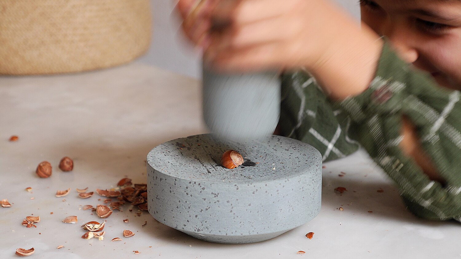 There are five objects. There’s the breakfast set: plate, glass and bowl that can be stacked, like a building set. Then we have the nutcracker and boxes with a pivot inside upon which the lid revolves. Spinning plate, on the one hand, is an ordinary serving dish but when you turn it upside-down its surface is concave and is ideal for a toy top. The final piece, a cup with large side handles, is in porcelain combined with recompacted soapstone powder.