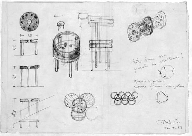 “Make a prototype,” wrote Edoardo Gellner (1909-2004) in script in 1958 at the margin of a sketch for a stool intended to furnish Agip village dormitories for the children of employees