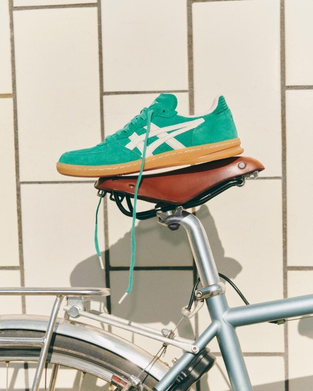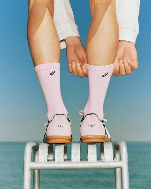 For the launch, Asics has also redeveloped the trainers to offer maximum comfort with advanced technology and premium material, matching their soft pink, blue and emerald green palettes with a modern feel. Featuring FlyteFoam in the forefront and EVA foam in the heel to create a functional and contemporary product, the new Skyhand Go outer shell is crafted from suede and leather mix with Asics and Hay logos on the heel and tongue.