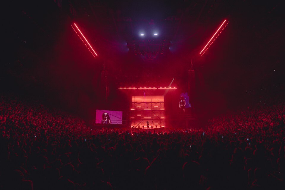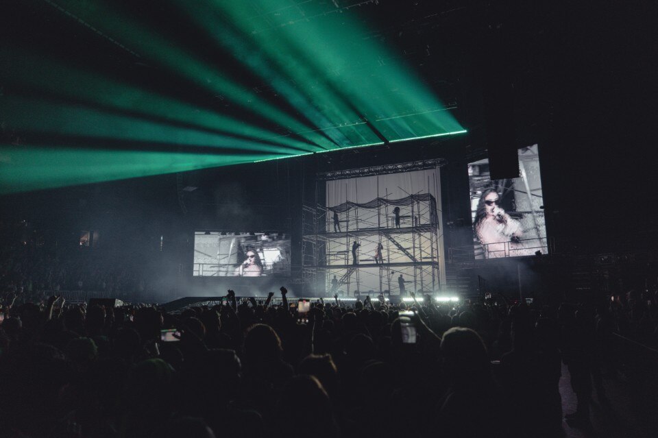 A key element of the design was a dynamic and modular stage, featuring movable trusses that, when lowered, created a more intimate atmosphere, while raising them expanded the visual impact, altering the configuration of the set throughout the performance. This was complemented by exposed scaffolding, LED towers, a kabuki drop, and two-tiered walkways.