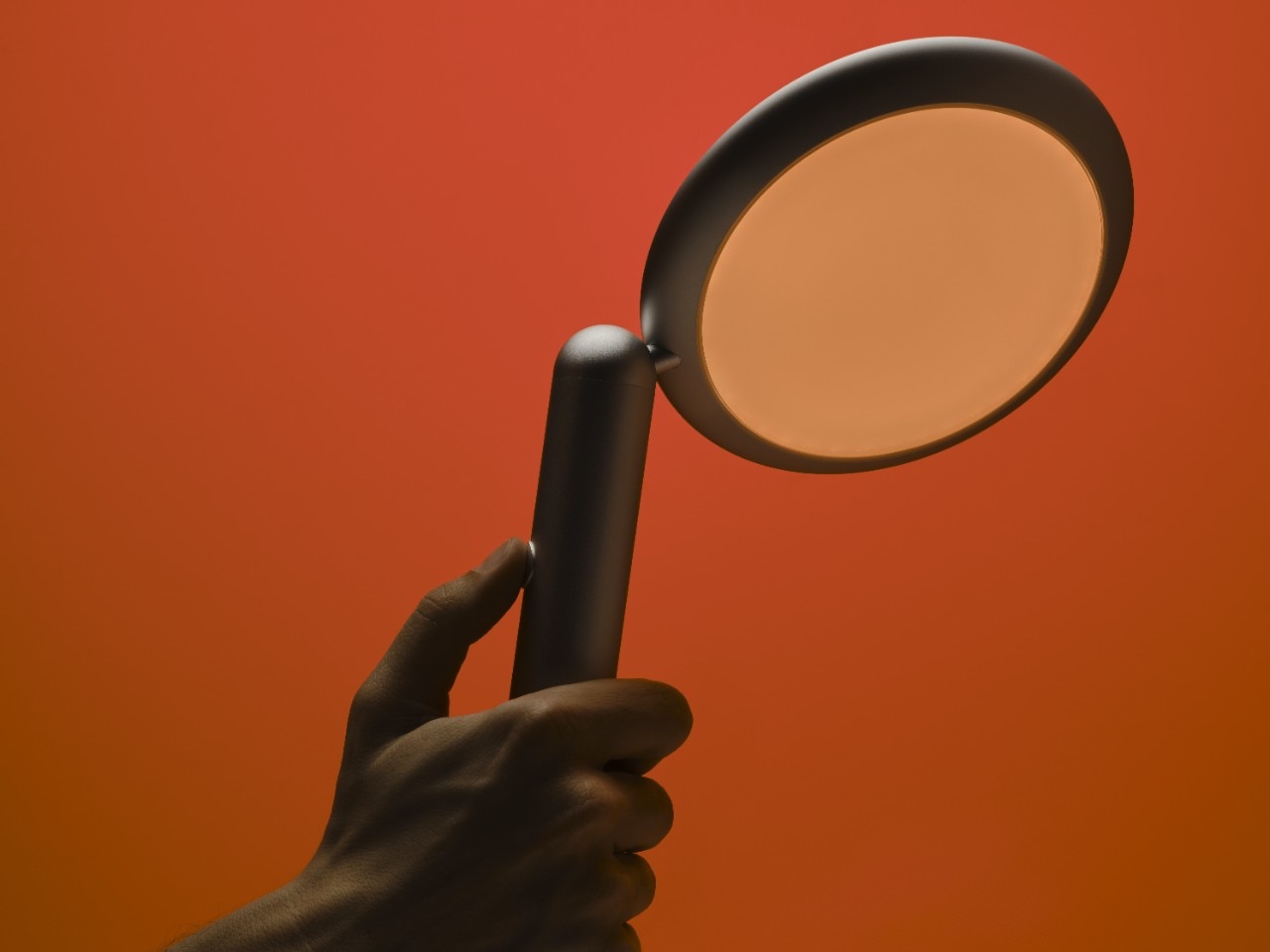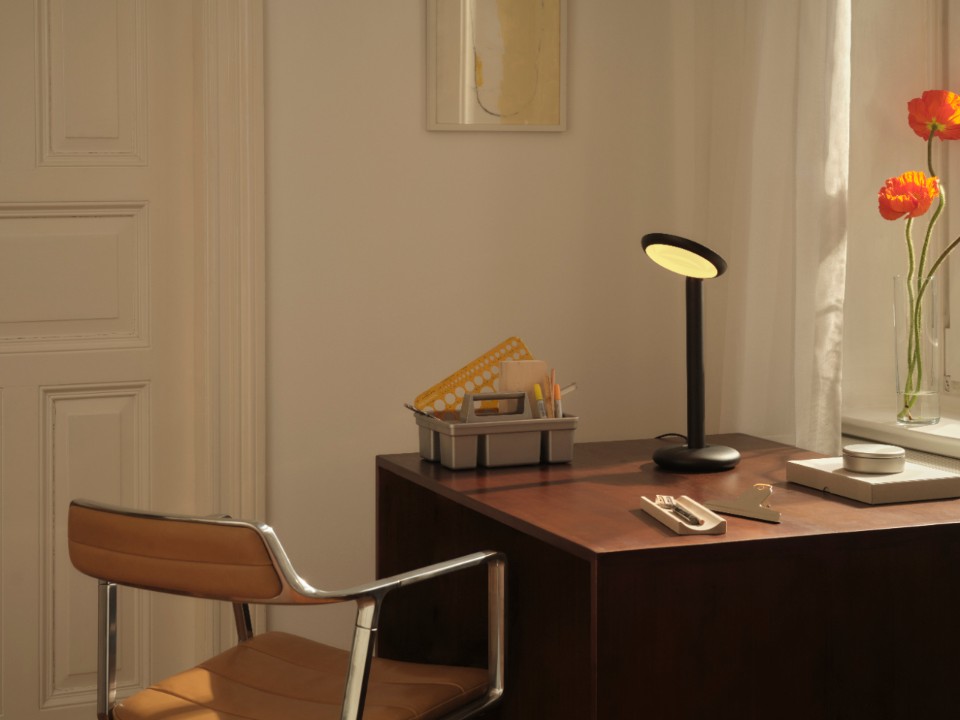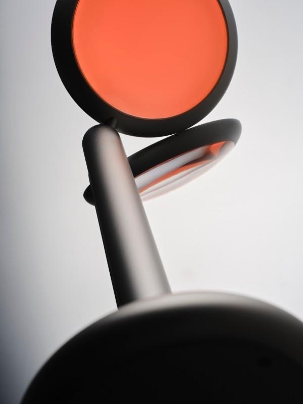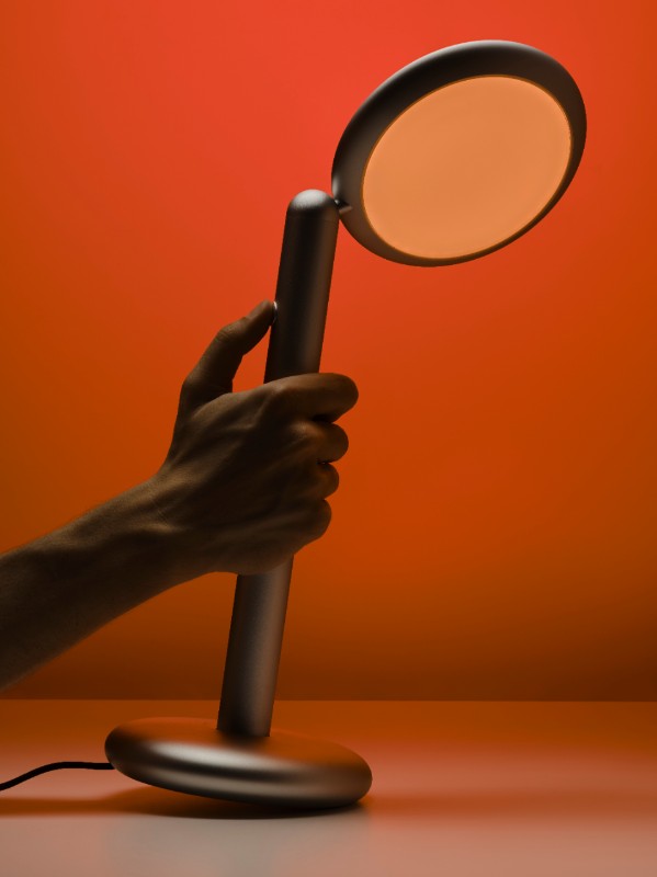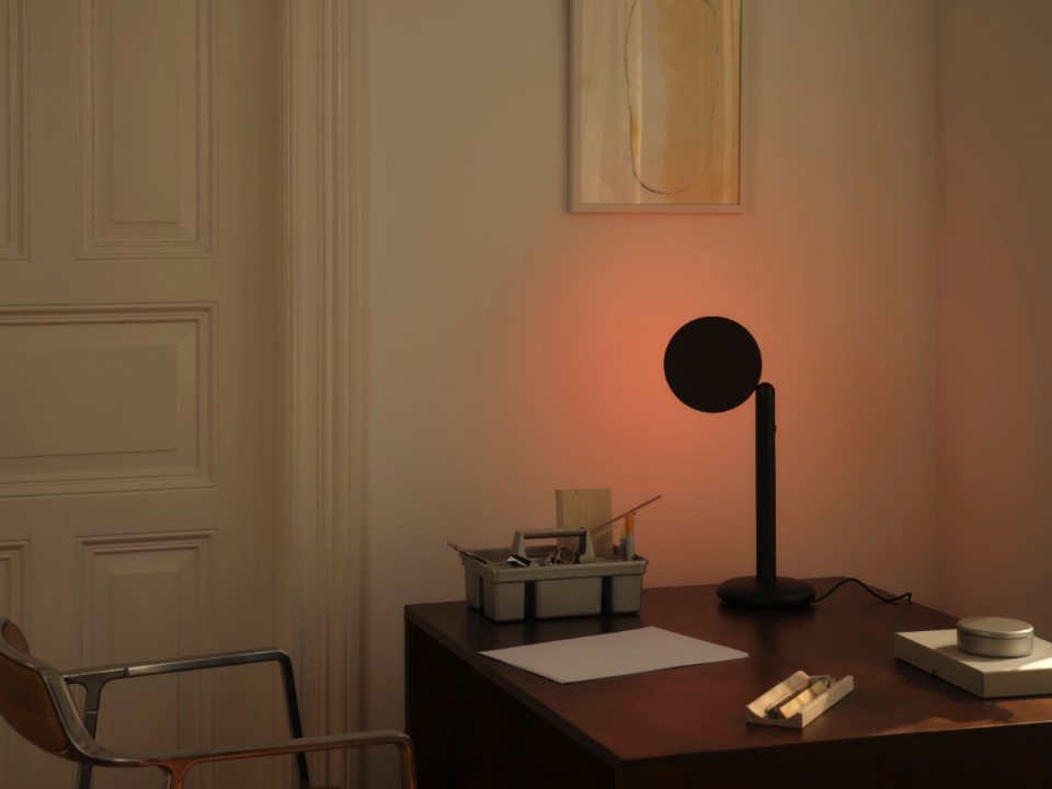Timon Grau places the lamp on a shelf and slowly rotates its head—a full 360°—until it casts a warm glow that, as the brothers explain, is directly inspired by the paintings of Mark Rothko. In this position, the lamp becomes a simple silhouette: one line, two circles. “A sculpture.”